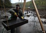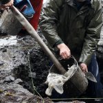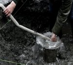 Usually on these kinds of sites, one also excavates the deposit with water, but such methods are slow going and require deep sumps and extra pumps (some to pump water into the unit, others to pump it back out) as well as complicate sediment traps to preserve fisheries values. Such logistical problems would not allow us to move much dirt at all. Thus, we dug with steel tools, both trowels and shovels, but when we were in the relatively thin layers that contain wood artifacts, we tried to remove the dirt in large blocks with a shovel (“chunk it out” to use our technical field vocabulary) and then carefully wash it in the screen. The less we scraped and probed with steel, the more likely that things would be found undamaged in the screen with the use of water.