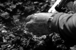 Water screening is essential for wet site materials since many are soft and inordinately delicate with their extreme age and so are easily damaged by steel tools. Therefore, we had to spray water into the screens too. This made rain a necessity though it was also a nuisance. A necessity because we were drawing our screening water from a very small creek which did not flow fast enough after a few days without rain. A nuisance because it always seemed to flow directly into the units, as shown in yesterday’s post. Heavy rain complicates photography, but then water in all its forms made things interesting as it made for constantly wet and dirty hands. I used Rainsleeves on several of the worst days and otherwise was careful to keep the camera dry. However, rain can also make much better photographs with the nicely diffused light and an interesting play of light from all wet surfaces.