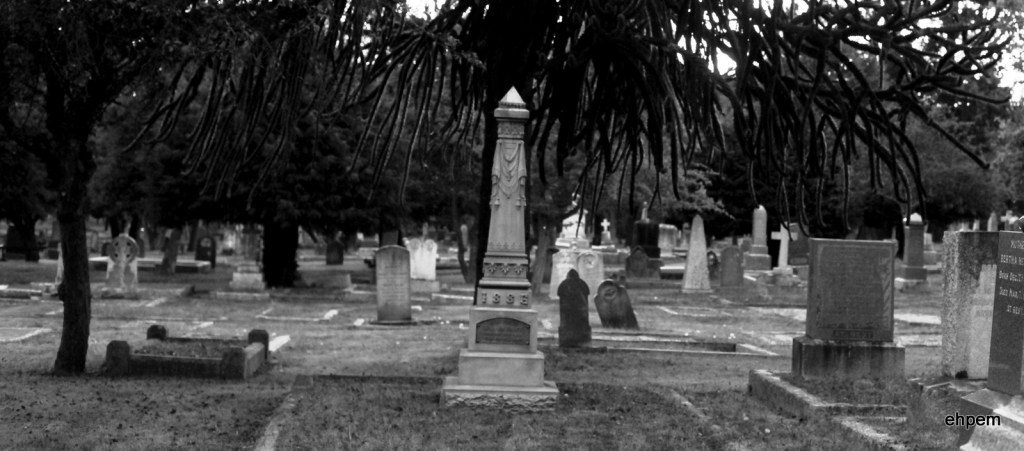 I like this monkey puzzle tree, umbrella-like over headstones, near the middle of the cemetery.