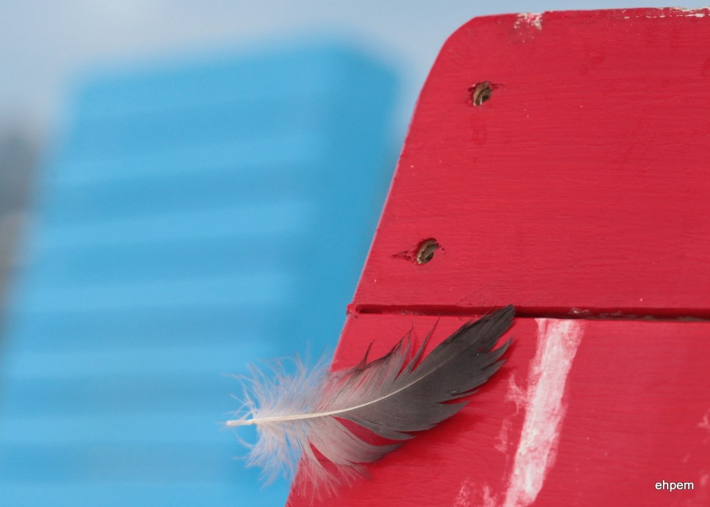 I was at Kitty Islet in McNeill Bay where someone has put one red and two blue Adirondack chairs. The birds perch on them and one left a feather to catch my eye.