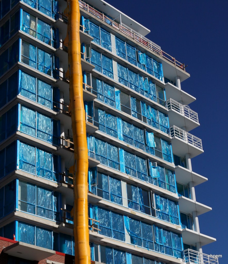 Victoria has seen a lot of construction in the past decade, and even though the economy is weaker these days, new buildings are still under construction. This building is quite striking with its protective blue covering and the yellow debris chute. Unfortunately, I think once completed the white frame is going to jar a bit on the horizon and generally look less interesting than it does during construction. Maybe it will be eye catching in sunlight against a dark or stormy winter sky.