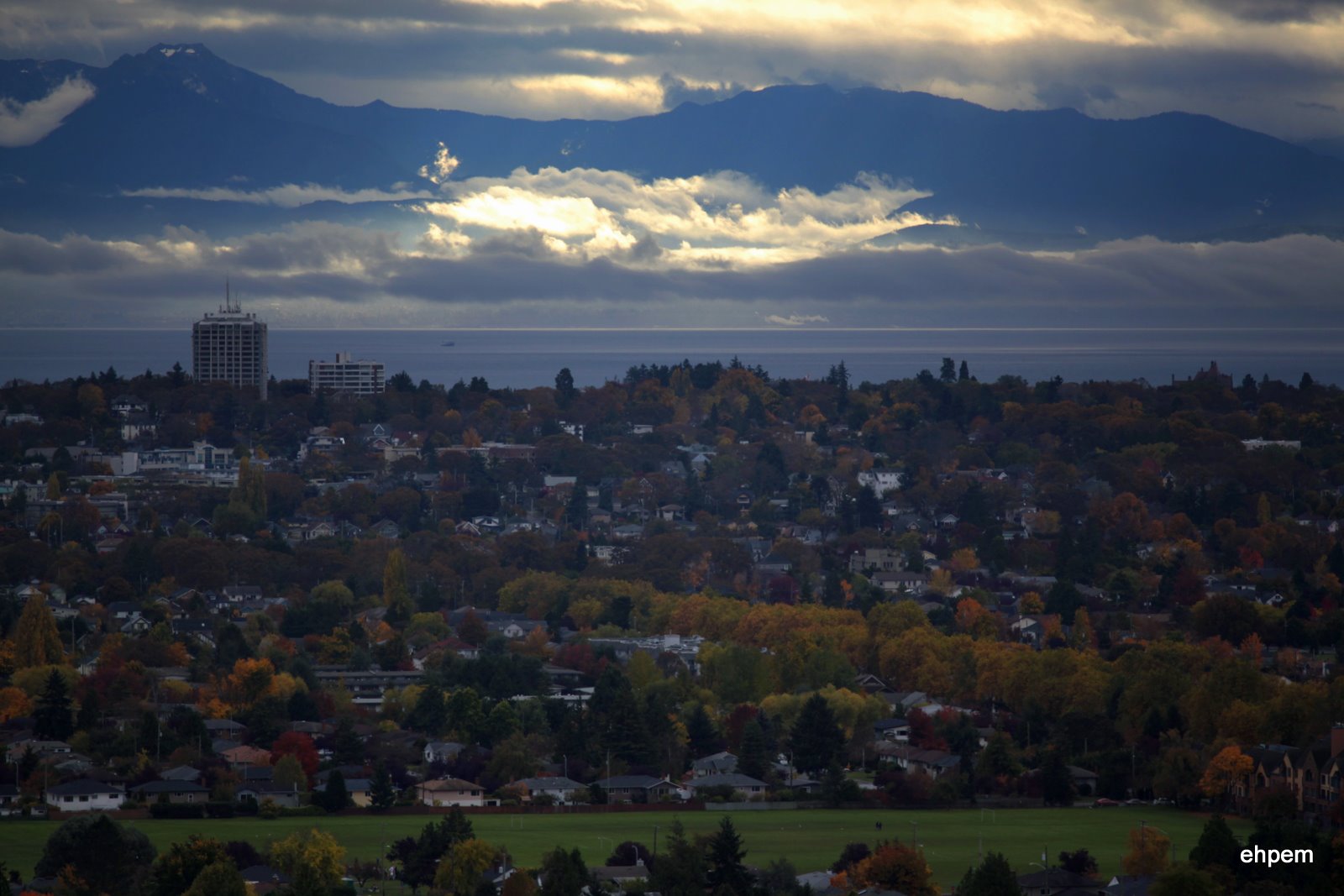 “Startling” is one word for that view of the Olympics from Mt Tolmie, “spooky” is another! By the way, that tower block on the left of the picture is the only bit of Victoria visible across Haro Strait from San Juan Island, USA. The building is on a rise just south of where Oak Bay Ave joins Fort St.