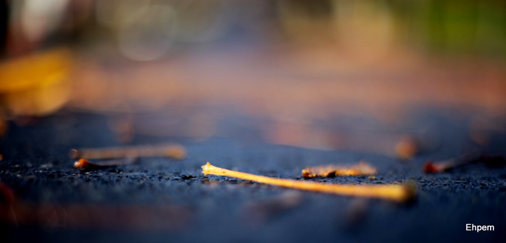 Today my attention was caught by the stems of leaves lying on the road surface. You know that fall is progressing when the leaves are mostly stems. These stems were nicely lit and glowing on the road surface. I don’t think I captured what I saw, and perhaps that was partly because my glasses had darkened up. But, I did have an interesting time with the camera resting on the road surface or near to it, with traffic passing by. And quizzical pedestrians. With nosy dogs.