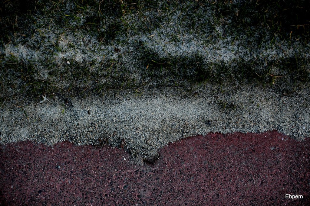 I could only look at the dune from outside the wall surrounding the Lafarge plant – it is part of just one of many piles of sediment used in different mixes of concrete, but it happened to be right next to the road. I noticed it because the side walk has mini sand dunes (see last image) along its edge from the sand grains that escape over the wall onto the street. I did have to climb on the wall to get some of these pictures. I even saw a dangerous looking pair of scissors that someone had tossed over the wall onto the sand, which can be seen in the foreground of the first shot. One shudders to think what it might have been used for.