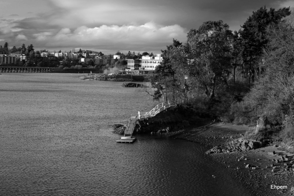 In my previous post Urban Dune I mentioned the feeling that dunes invoke for me of there must be a palm tree just the other side. Well, this being Victoria, in fact there is an Arbutus grove just the other side of this dune – it is up-inlet of the Bay Street Bridge which the dune is next to and from which this photo is taken. The small dock and arbutus grove are in front of Point Ellice House, a heritage structure built in 1867 as the residence of early pioneer and land surveyor Patrick O’Reilly. It is surrounded by industrial lands – many of them in the “wasteland” category, including on its far boundary a metal recycling yard that belches smoke, fumes, flames, explosions and immense noise on a regular basis. The O’Reilly property is an oasis in this industrial desert and a reminder of how wonderful this waterfront must have been prior to development. The house is another National Heritage Site (another is the Chinese Cemetery, a frequent visitor to this blog) and is owned and managed by the provincial government’s Heritage branch.