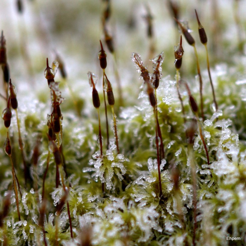 Two weekends ago we had a hard frost, or at least some did since there was none here on Harling Point. I found this frost near the south end of Wallace Drive in Saanich (or is that Central Saanich? – near the middle of this map). The road cuts through a mound of bedrock on its east side which is completely covered with thick native mosses. The light was quite bright, but diffused through a layer of cloud and the frosted moss stood out brightly against the darker forest and rock, pulling me in for a closer look.
