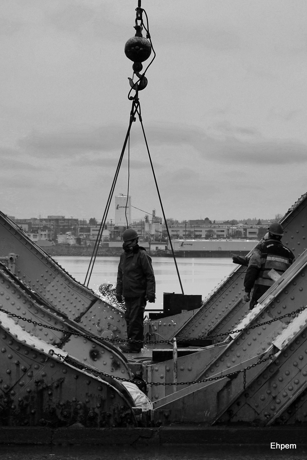 More pictures from the removal of the railway span of Victoria’s Johnson Street Bridge a few weeks ago. These pictures are taken on three different days. Included is a picture of the smaller crane barge being towed towards the harbour through the Strait of Juan de Fuca – I happened to be taking pictures on the beach in front of Beacon Hill Park when it went past.
