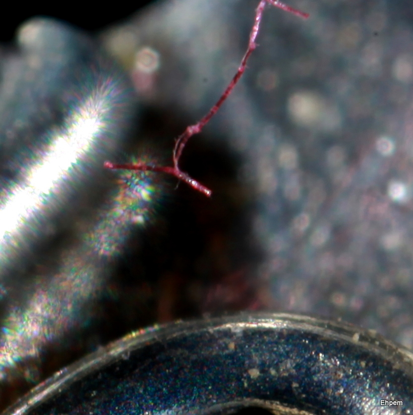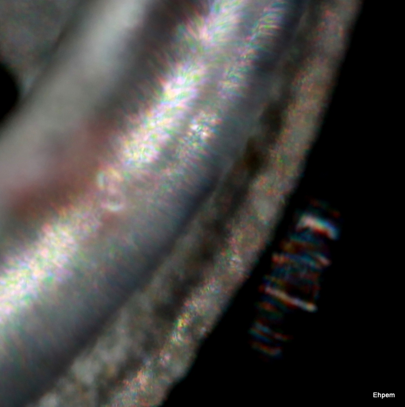 This object, with its shiny metal surfaces has some very interesting optical artifacts, a couple of which I have cropped and enlarged below, but which you can easily see on the shot above as well. Little explosive bokeh rainbows. All the crops are the same size (about 125%) from the same image, a variant of the one above with a different focal point. Some of them show off my dusty sensor too which I did not clean up.