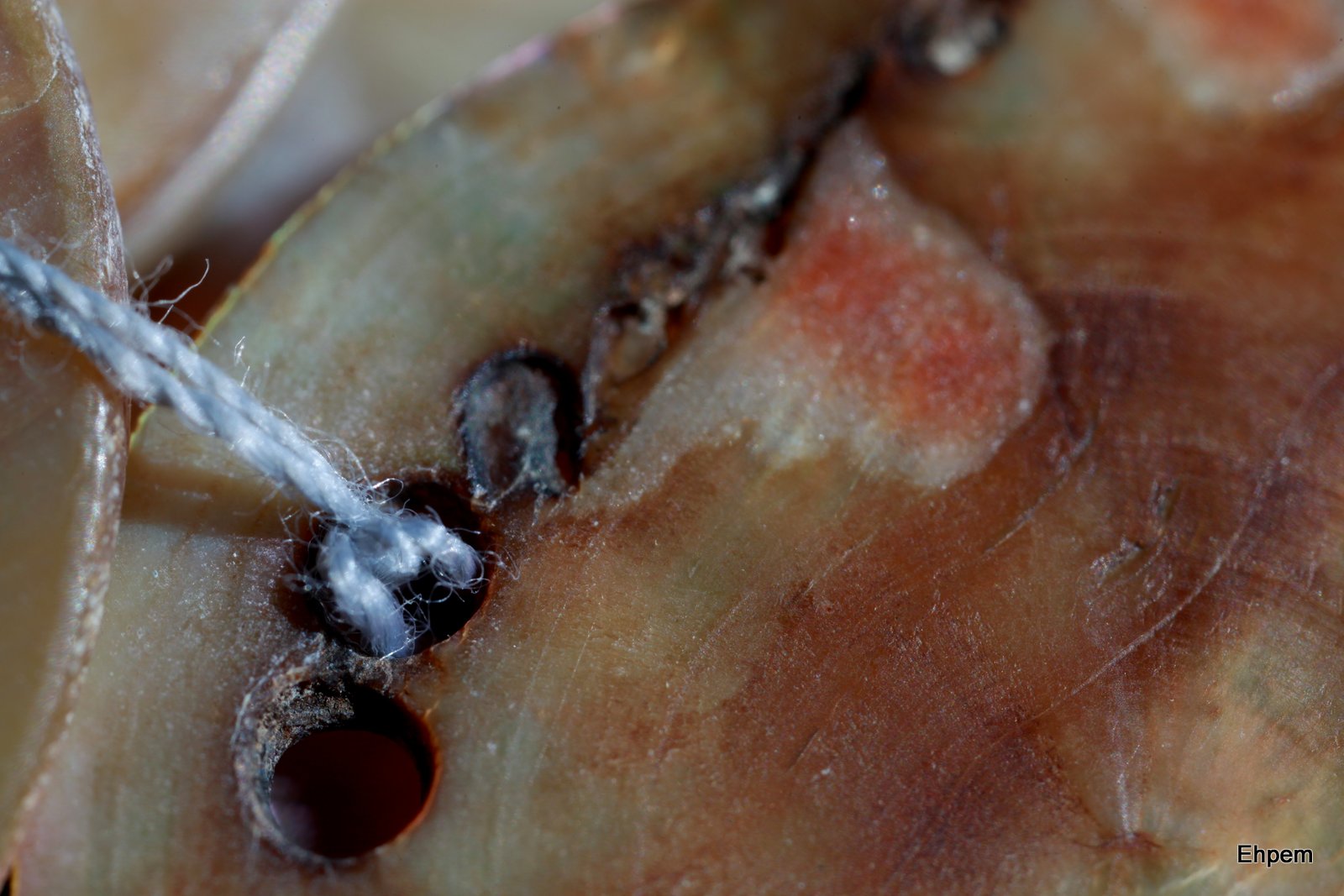 I think this is actually two buttons, there are several held together on a small string. Since they are shot at up to 5x magnification I can’t see enough of these to tell if they are the same one or not. They reside in a button tin with other subject matter that has been seen on this blog, like glass buttons, an incised ball bearing, a small snap fastener and other sewing doo-dads. Occasionally an old button is used for some special sewing project. No one that has such a button as these on their night-shirt (of which I have half a dozen all with nice buttons some probably from this very tin, made of linen, cotton-linen, and even a cotton-raw silk mix, I think – aren’t I lucky?) would ever notice the tiny saw teeth marks on the margins of the button where it was cut out of the larger shell. The colour and textures of this shell, especially so close, looks very much like it could be bone, but that is just a trick to the eye. And, actually, I am not sure if these are technically buttons as the holes are off centre near one edge only so they may have been more decorative items of some type.