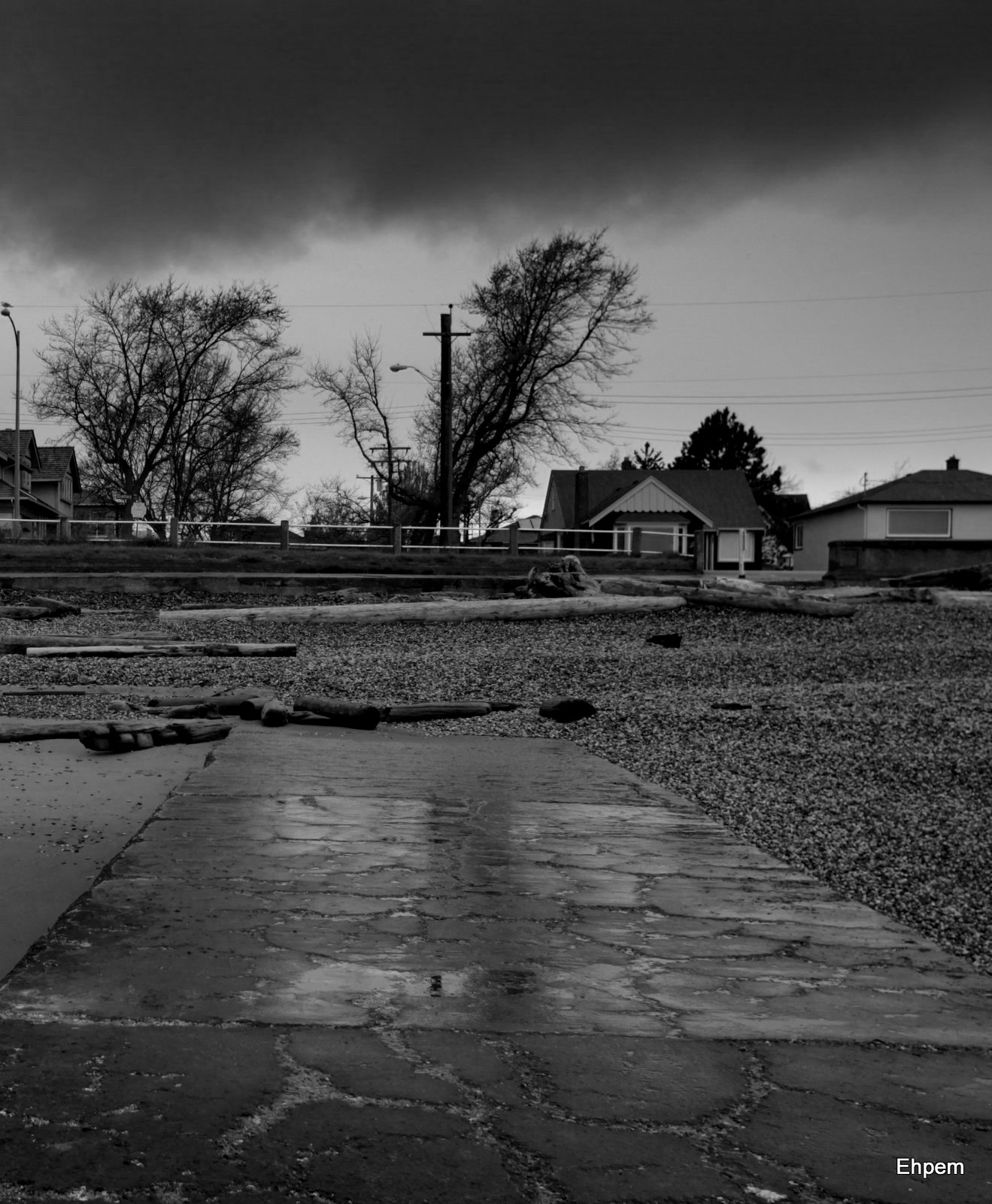 This is another view through the 24mm lens, though I have cropped it quite heavily. The picture was taken on the same rainy day as the last drain picture I posted – the wet surface of the drain is fresh water since the waves were small and the tide quite low. I like the subtle reflections of the tree and utility pole on the drain surface.