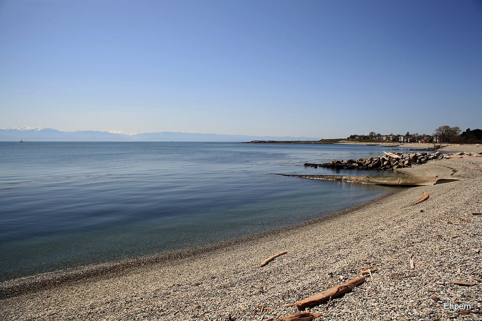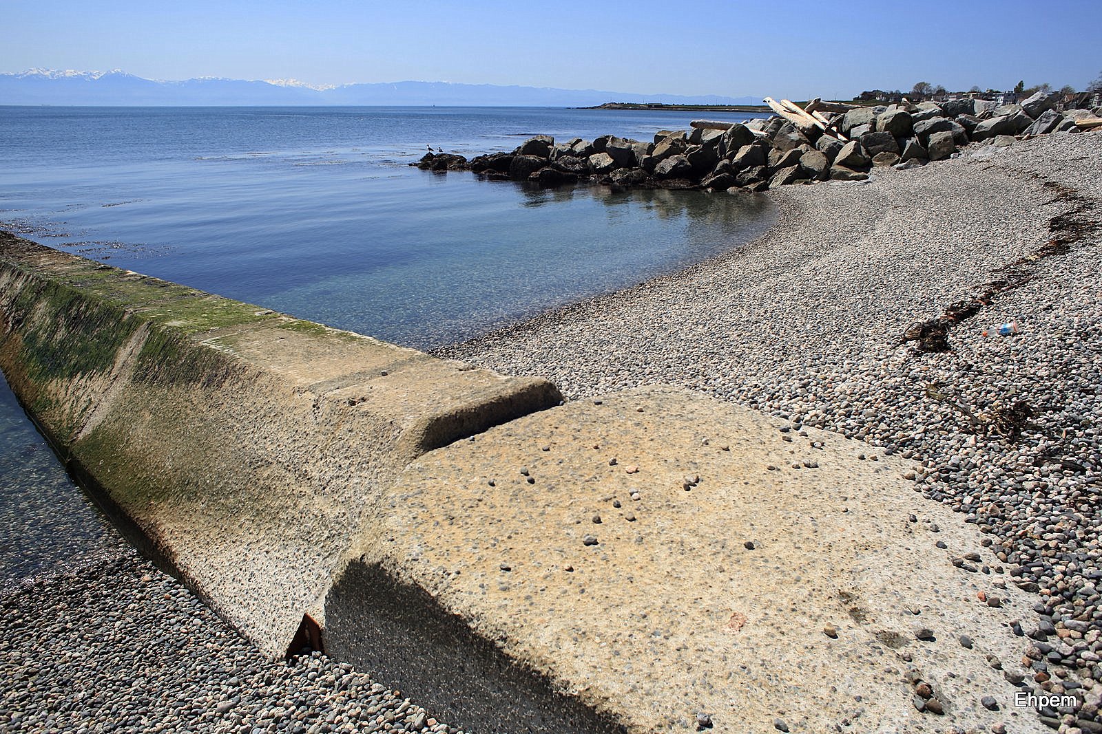 This drain is in front of the cemetery and lies beside one of the rip-rap groins that were put in to hold the pebbles in place. This is an artificial beach that was created 10 or 12 years ago as a solution to the crumbling sea wall in front of Dallas Road in Ross Bay. The earlier beach was rocky, weedy, slippery and exposed only at low tide, with a 10 foot or more sea wall holding up the road and the cemetery. In fact, it was installed many decades ago after the cemetery started to erode, and dropped coffins onto the beach where the road is now. This massive sea wall was considered too expensive to replace, and in any case, in winter storms waves would be thrown over the wall and across the road, sometimes carrying logs and rocks and other debris. Every winter the road was closed during big storms. The groins were put in to interrupt the long-shore drift and an endless stream of barges arrived for a month or two with these pebbles which were fed onto the beach. It was a really big operation, but it has worked out far better than I thought possible at the time. The old beach was unusable and this one gets a lot of use in nearly all weathers. The waves rarely make it onto the road and I can’t remember the last time it was closed due to a storm, though sometimes a few pebbles litter the road surface after a good blow.