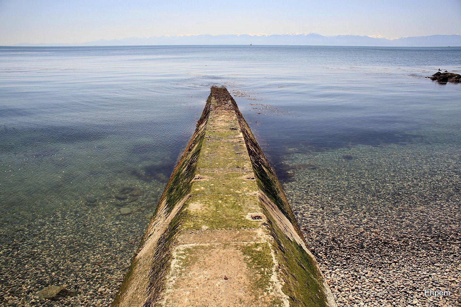 It was a lovely sunny day on Saturday – a day when people were sunbathing for the first time this year. We walked the length of the Ross Bay beach on our way to the Moss Street Market. The tide was lower than usual, and so this drain was well exposed against a perfectly calm sea. The Olympic Mountains still have a lot of snow in the distance – they were worthy of a telephoto shot, but that was not going to be.