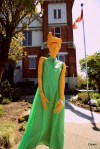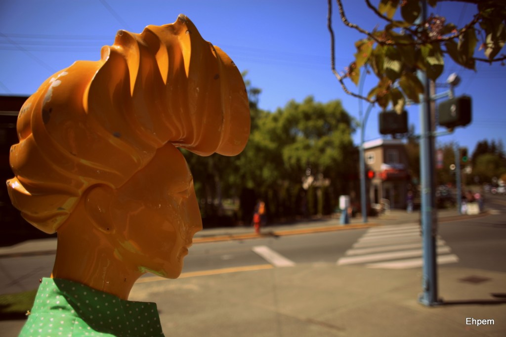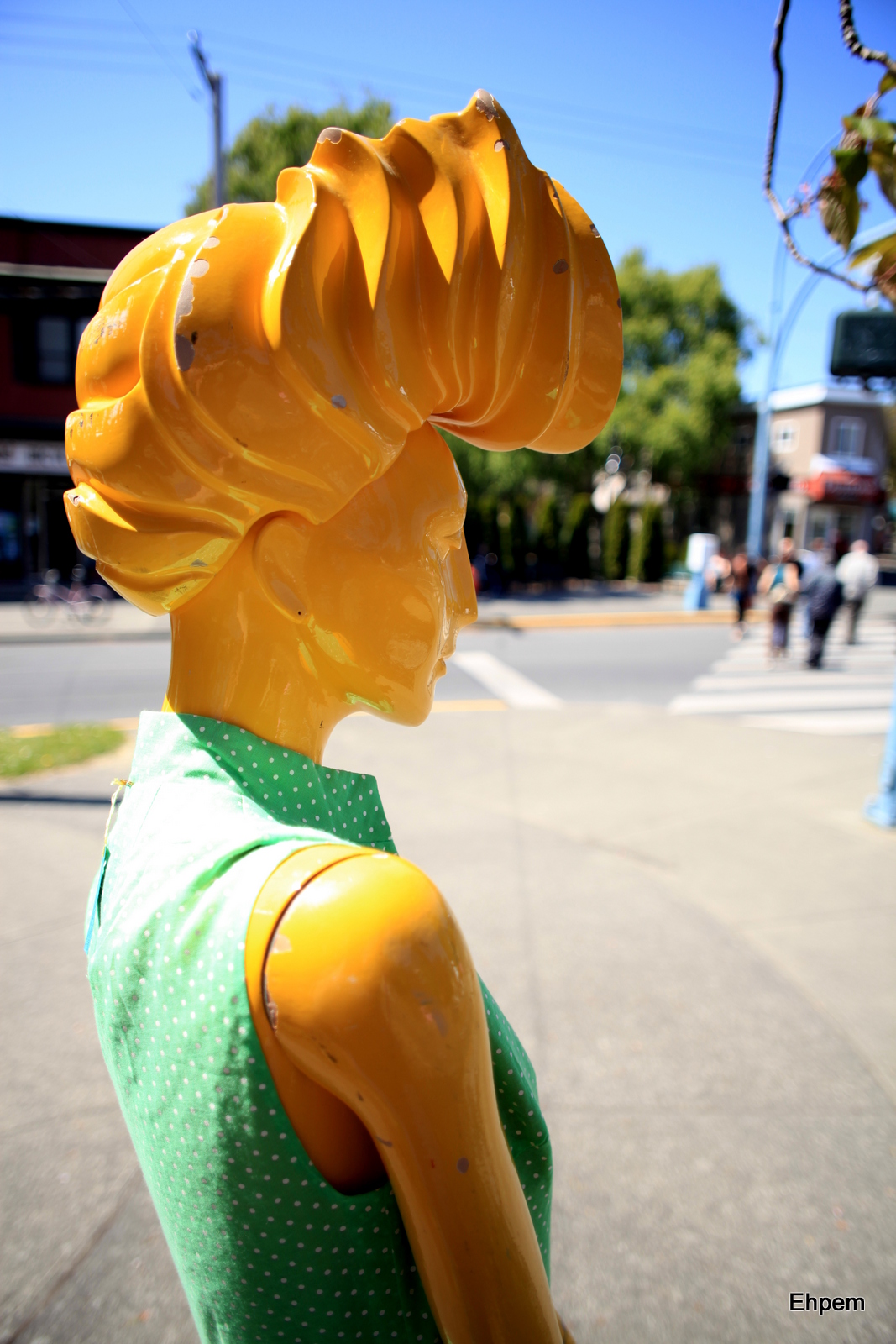 This totally outrageous mannequin is being used to advertise a sale of vintage stuff in a church hall across the street from the Moss Street Market. Someone with a good eye for grabbing one’s attention dressed it in a suitably vibrant colour to match the yellow skin. I spotted this display from the other side of the street and down a ways. How could one miss it?