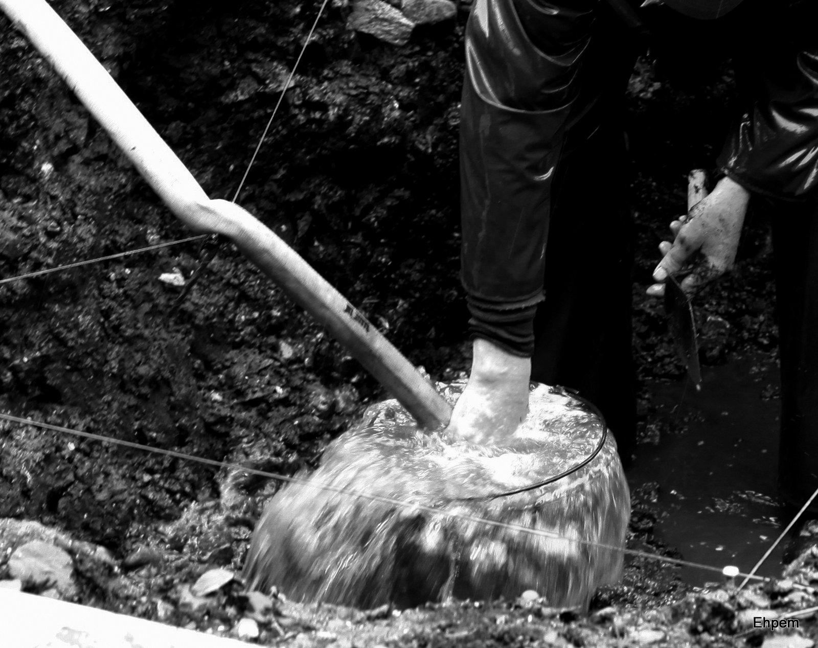- Commencing filling the unit before the tide pours in – fire hose set in a bucket to prevent erosion.