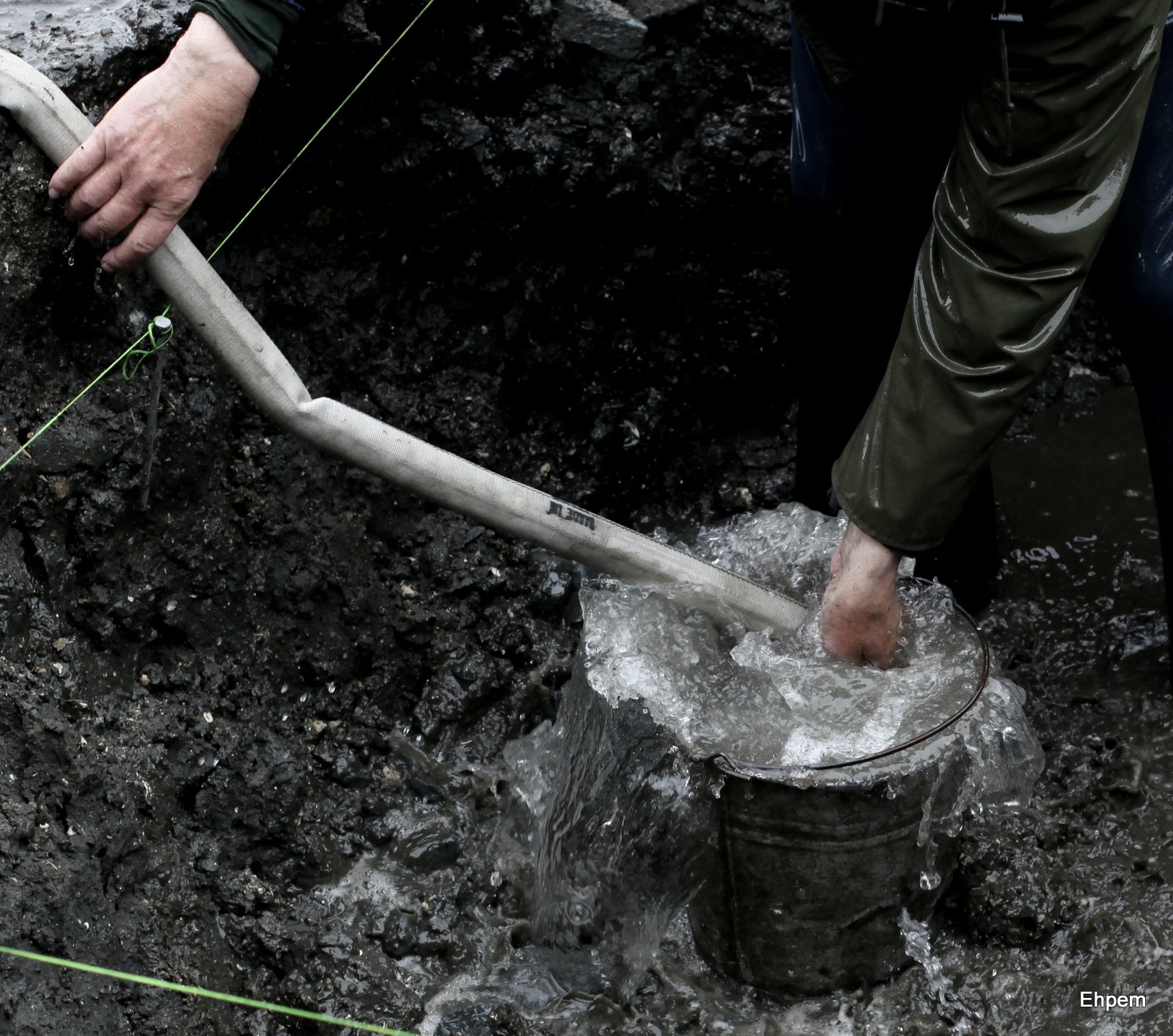 Water screening is essential for wet site materials since many are soft and inordinately delicate with their extreme age and so are easily damaged by steel tools. Therefore, we had to spray water into the screens too. This made rain a necessity though it was also a nuisance. A necessity because we were drawing our screening water from a very small creek which did not flow fast enough after a few days without rain. A nuisance because it always seemed to flow directly into the units, as shown in yesterday’s post. Heavy rain complicates photography, but then water in all its forms made things interesting as it made for constantly wet and dirty hands. I used Rainsleeves on several of the worst days and otherwise was careful to keep the camera dry. However, rain can also make much better photographs with the nicely diffused light and an interesting play of light from all wet surfaces.