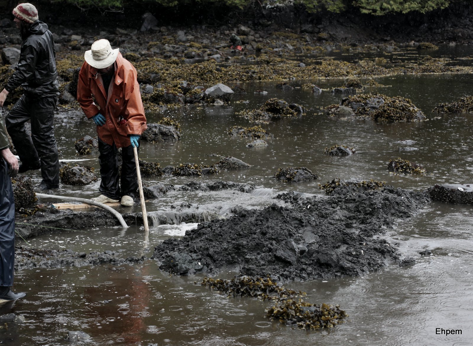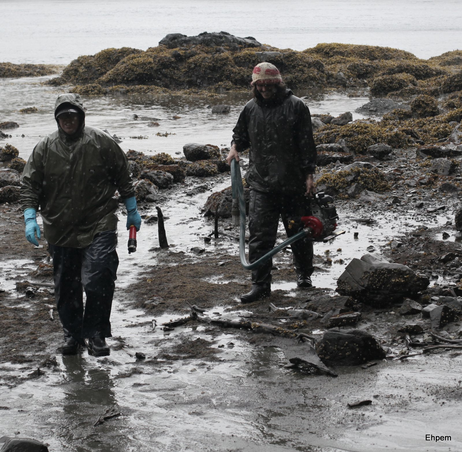Tides in Hecate Strait are big tides, bigger than most other parts of the Northwest Coast with a tidal range of about 24 feet compared to the more normal 12 foot range. It was necessary to work with them as the site is under water from mid tidal levels. And low tides seem to have a habit of occurring in the dark, or early morning hours, so water dictated and scheduled many of our methods. The tides flooding into the archaeological units can be ruinous, eroding the sides away and destroying the stratigraphic profiles in just a few minutes. This meant that we had to leave enough time to pump water back into the units to stabilise them when the tide came over that part of the beach – we used a high volume fire pump for this process as there was usually no time to waste. When these big tides get going across a somewhat flat surface, you can see them moving, without any need for time-lapse photography. A rising tide sure does motivate you to get things done, and quickly. Some days we worked 8 to 10 hours without a break to make the most of the available tide window, with a push near the end to stockpile buckets of dirt for screening once the tide was over the site, and we had eaten lunch.
