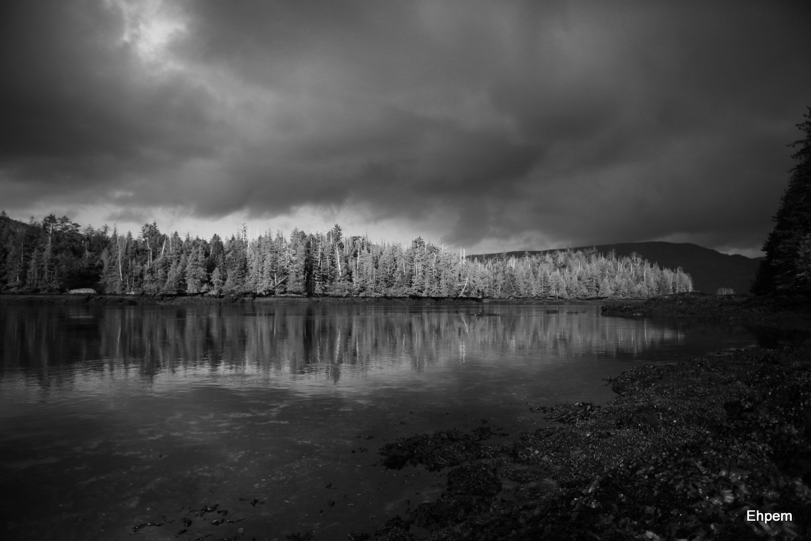 Dawn was typically viewed as we went to work at the Kilgii Gwaay site the first few days, and sunrise was viewed as it lit the shores opposite the site while we worked, as in the above picture.