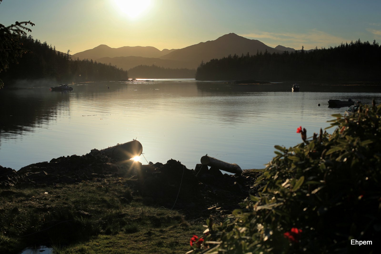 We were treated to a wonderful sunset while we were over there – a real treat for us since our cabin faces south in a narrow bay the headlands of which block both the sunrise and sunset. The pictures are looking out the southern arm of Houston Stewart Channel where it runs between Ellen Island (Kilgii Gwaay which is on the right in the middle picture) and Kunghit Island, on which Rose Harbour is situated. The mountains/hills in the background are on the south end of Moresby Island.