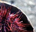 Urchins are a very serious problem in Haida Gwaii and other parts of this coast too. In quantity they are an indicator of ecological imbalance triggered by the extirpation of sea otters, which feed heavily on them and used to keep their numbers in check. The urchins feed on algae and create havoc with kelp beds which are like forests in the ocean, supporting huge numbers of organisms and animals that feed on them. Large kelp beds also serve to dampen wave action and reduce coastal erosion  – they also result in different beach sediment types in their lee than when the kelp is gone. Without sea otters there are many places that are termed “kelp barrens” where the sea floor is covered with Guudiingaay, so close together they are nearly touching, and no kelp. Since urchins are an important fishery (for the Asian market almost exclusively – termed Uni in Japanese they are very highly valued) there are commercial pressures against the reintroduction of sea otter. Probably pointless since as their numbers grow on the Alaska panhandle and north west Vancouver Island they are very likely to move over to Haida Gwaii without human assistance.