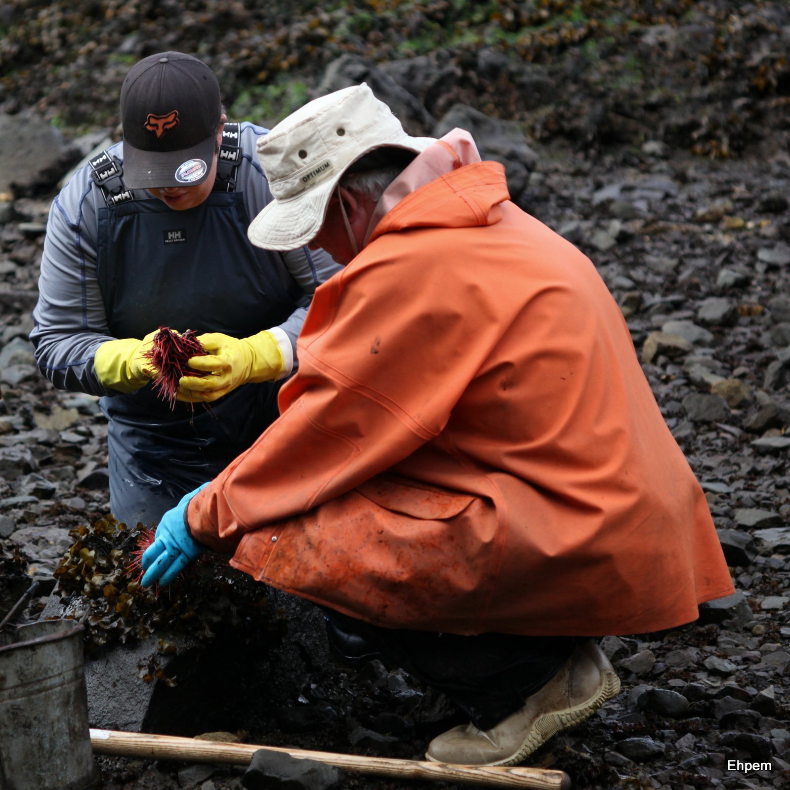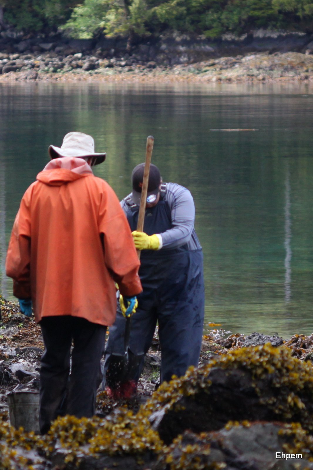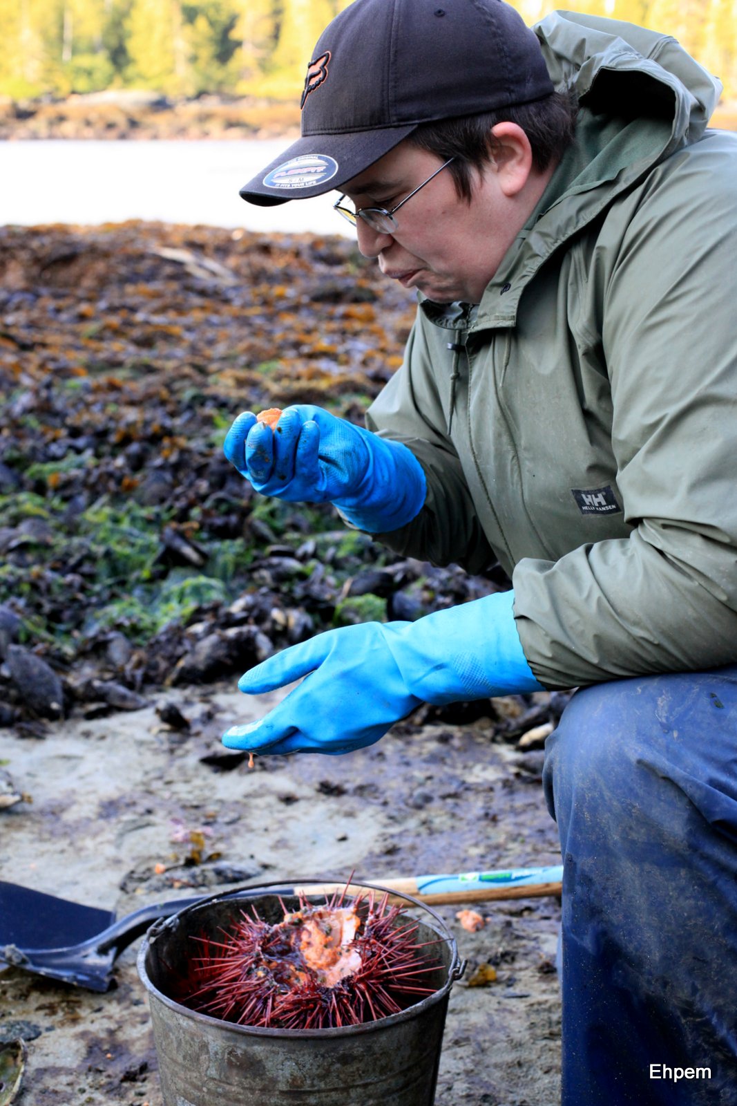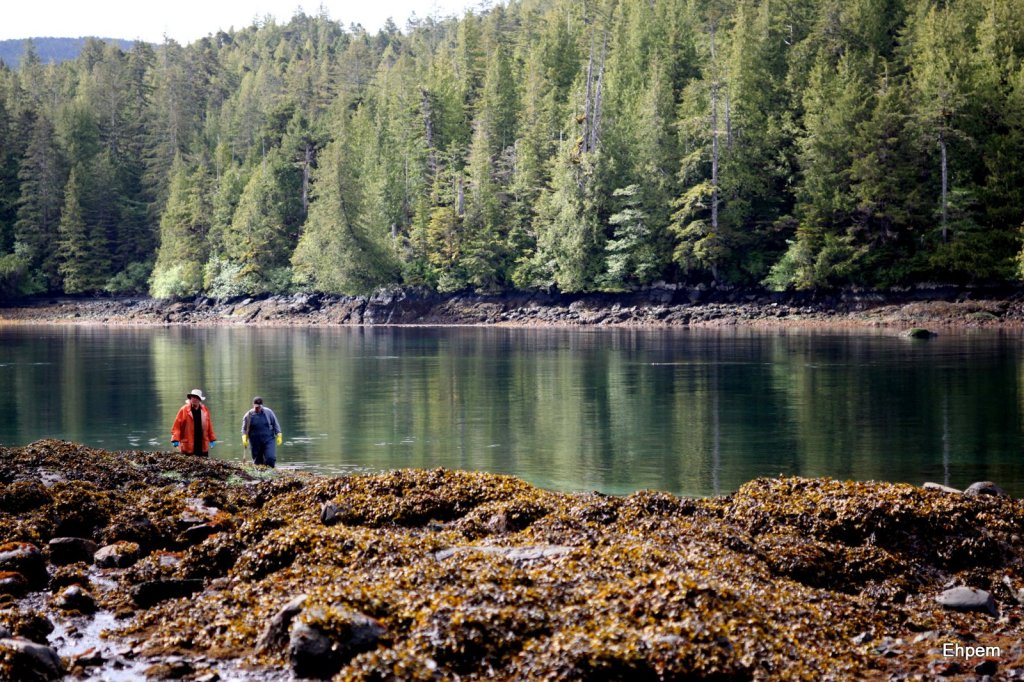 There is fishing, and there is fishing. Yesterday’s post was about fishing with a jig in deep water. Today’s is about fishing with a shovel by scooping Guudiingaay off the bottom just beyond boot height at lowest tide levels. Guudiingaay is the Haida word for sea urchin, and that is the term used on the project this year. For Goox and Dale especially these were a nice light morning snack, freshly caught and opened by Goox; shared with all that were willing. Some were eaten by the shore, others stored in a bucket by the screens, for higher tidal levels.