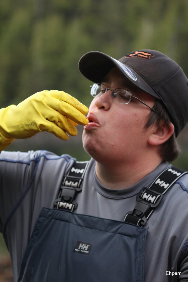 Many times I have been set up by First Nation’s colleagues to eat something that they think I am going to cringe at. Fortunately, I was raised by a marine biologist and every summer when I was pretty young we went to a fantastic barbecue near the marine station where all kinds of unusual seafood was eaten as if it were perfectly normal to do so. So, I was well primed and probably a pretty disappointing target for my crew. And, very occasionally I was able to turn the tables by eating something that grossed out crew members – “oh no, we don’t eat that”. That was fun 🙂