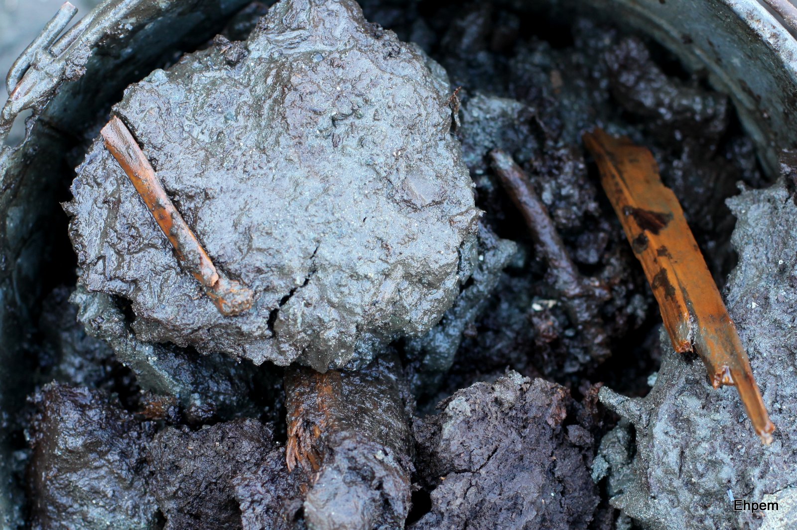 - Bucket with bird bone (L), wood pieces and clumps of peat from the pond edge.