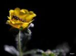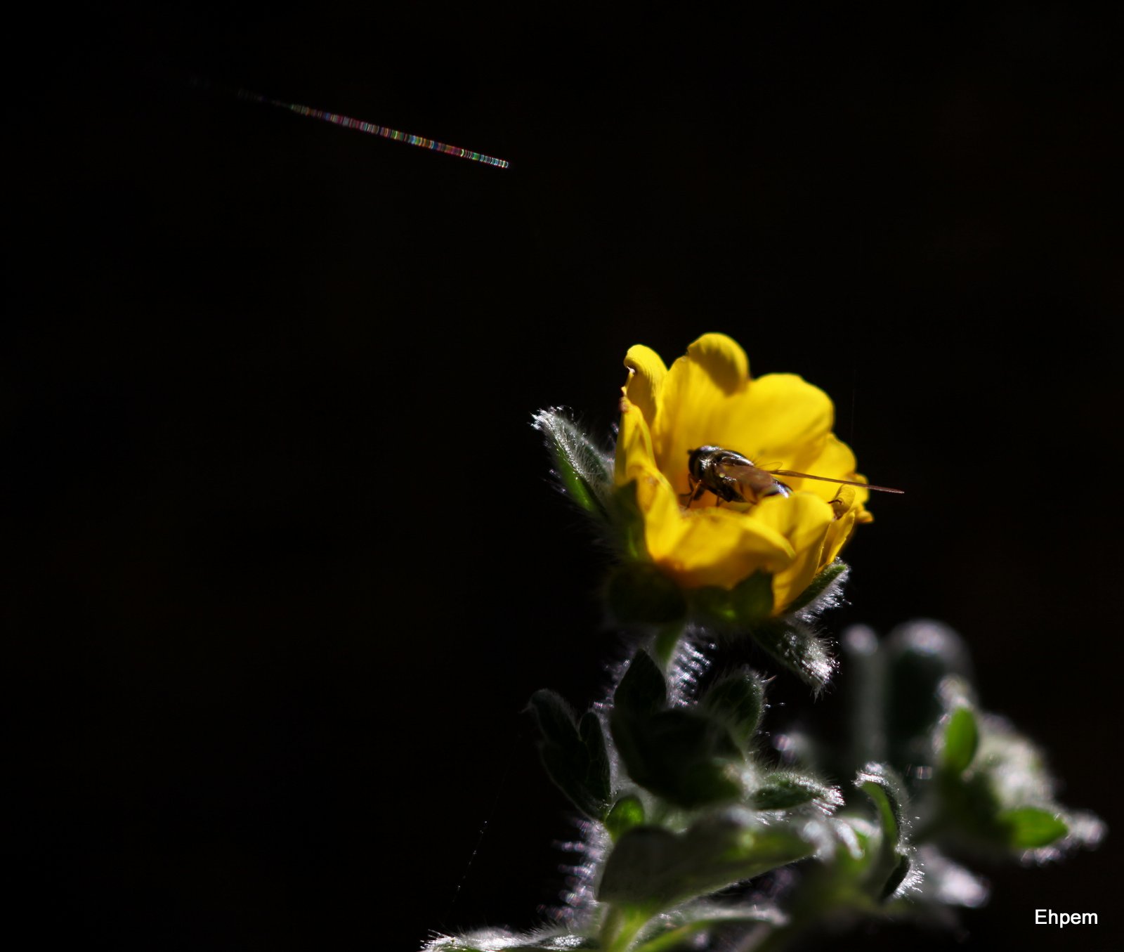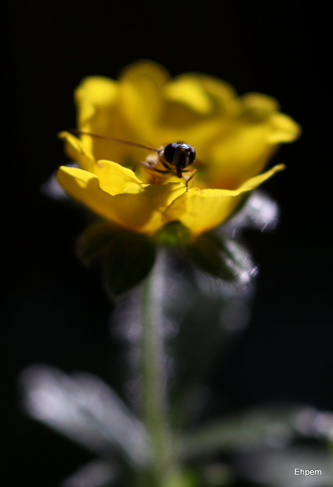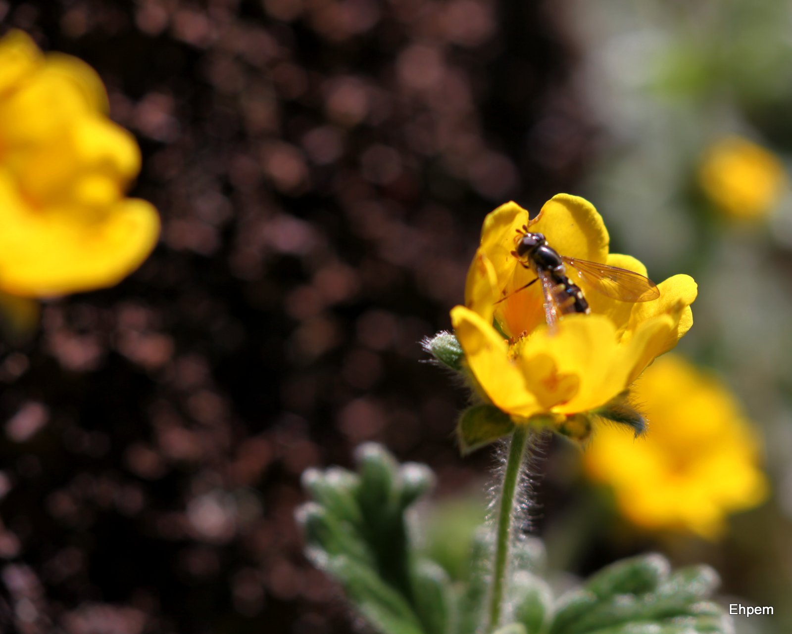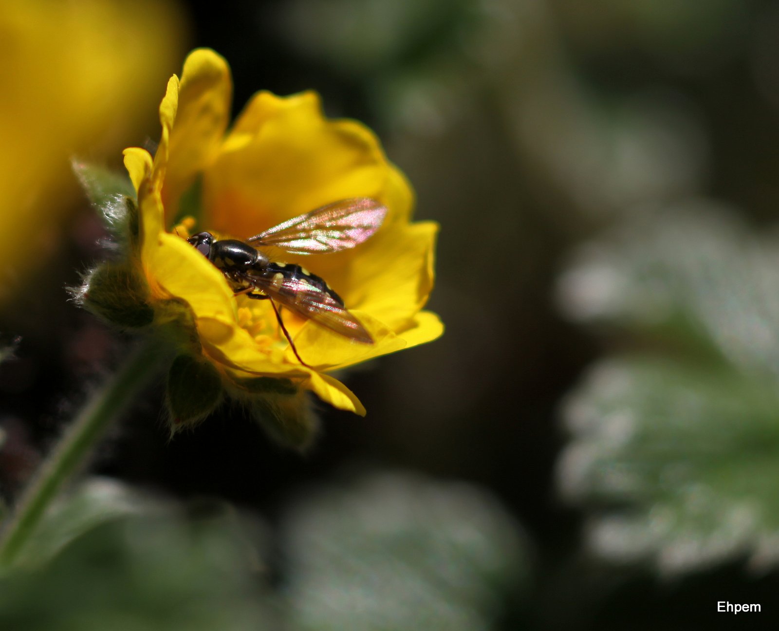 One thing that caught my eye was a fly in disguise as a wasp, that was visiting the blossoms, one after another. Today’s post features the fly on the cinquefoil. Other post(s) will have some other shots from this session.