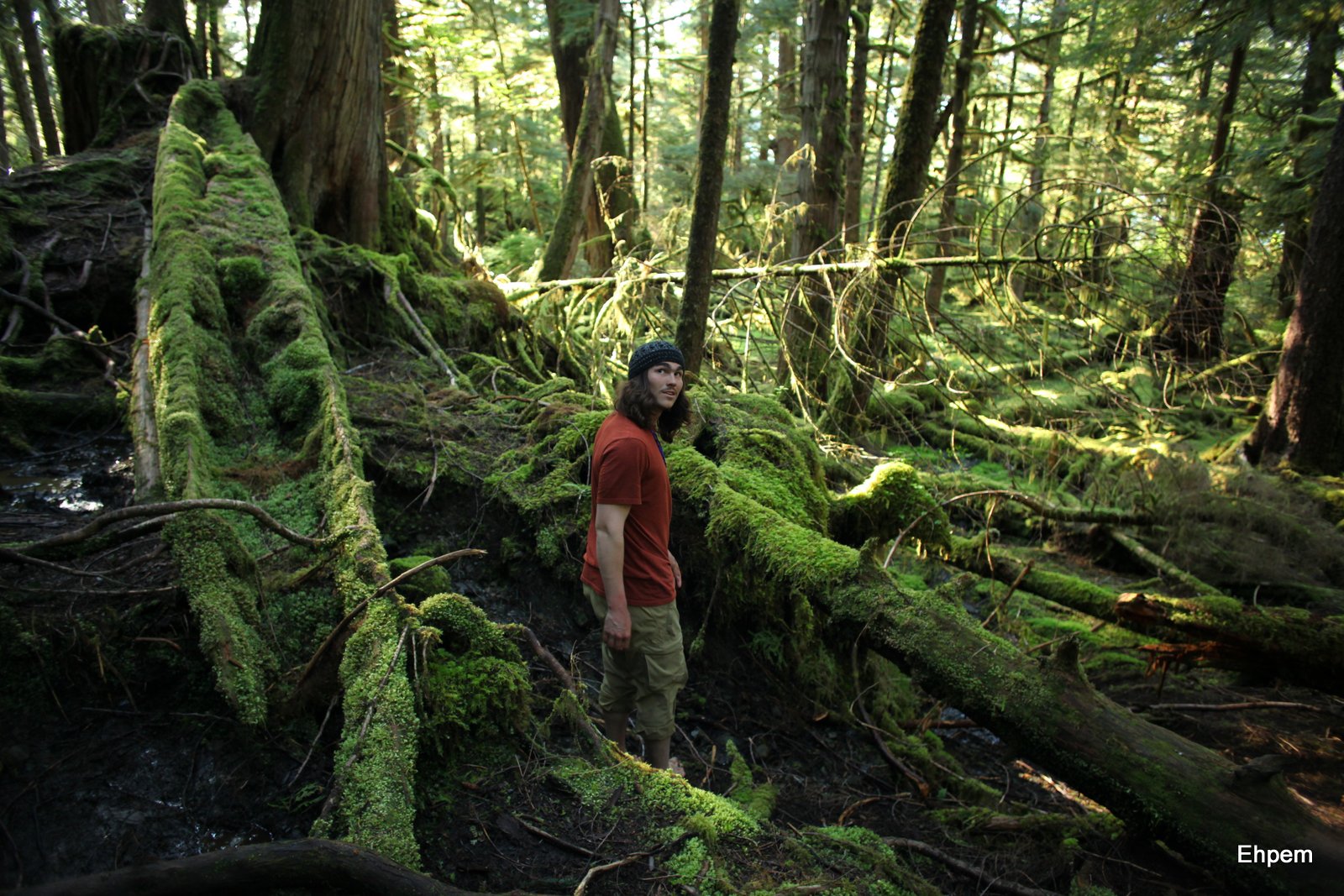 Another interesting thing to look at in Rose Harbour is found in the woods behind the houses. This is an unfinished Haida canoe, left to rot probably 125 or 150 years ago. Haida canoes are made from Western Redcedar logs, which were felled and segmented to the right length and then split in half. Sometimes two canoes could be made from the same log segment. Typically the bottom is shaped first and then they are rolled upright and the inside hollowed out. Once shaped properly they are steamed and the sides are stretched open wide so that they have the appropriate shape to reduce rolling and otherwise increase seaworthiness.