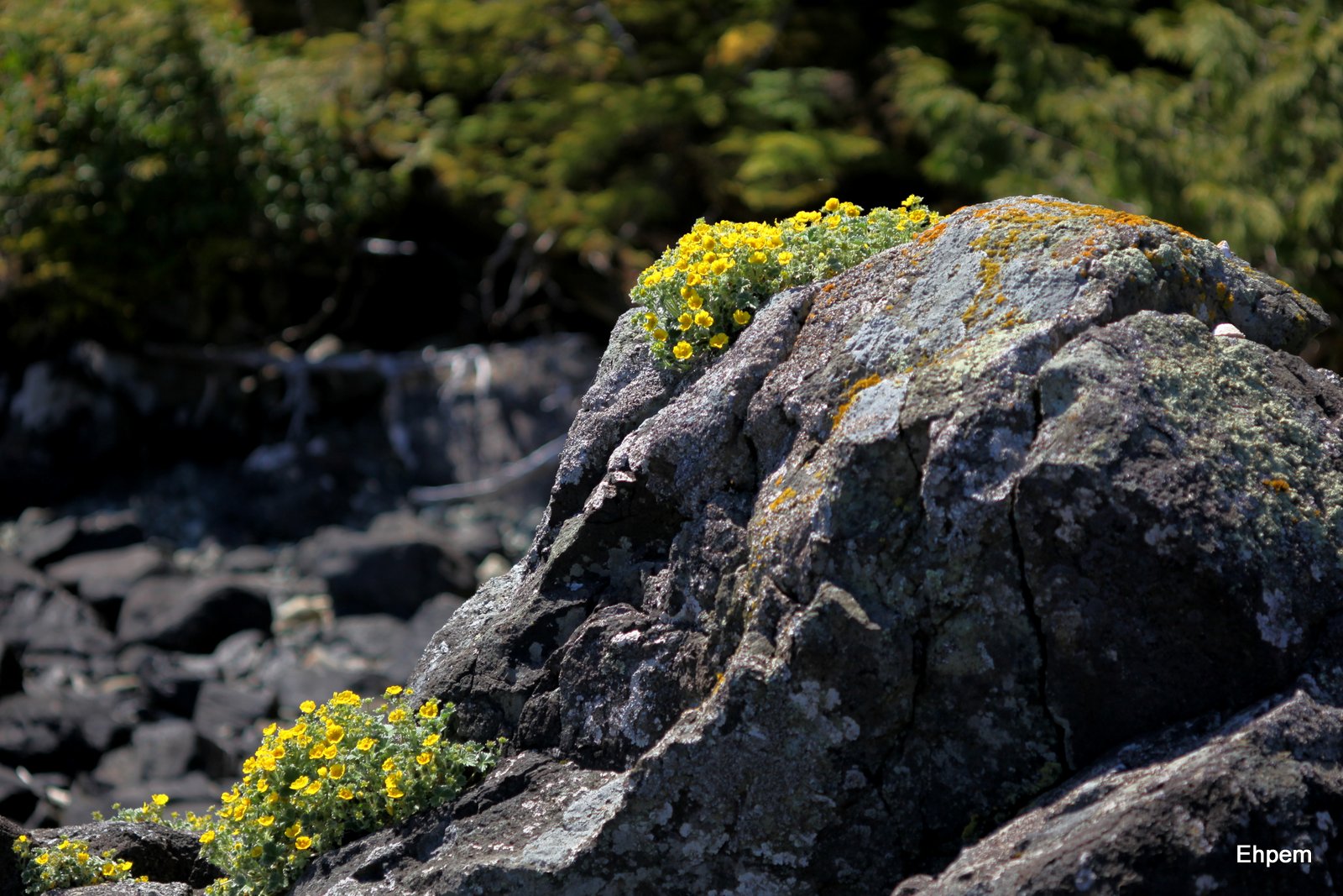I have previously posted pictures of flies on the hairy or northern cinquefoil (Potentilla villosa) which is on a glacial erratic in the intertidal zone near the cabin. In that post one of my regular readers, K. Ryan Henisey, commented with the Haiku above – what a treat! He has graciously gave me permission to use the poem with this second post of cinquefoil pictures from the same location. I find his blog, lifeasgood, a terrific mixture of haiku, photographs, paintings, illustrated monster stories, musings on being a teacher and so on. And besides all that his favourite meat is Guudiingaay, so what’s not to like?
