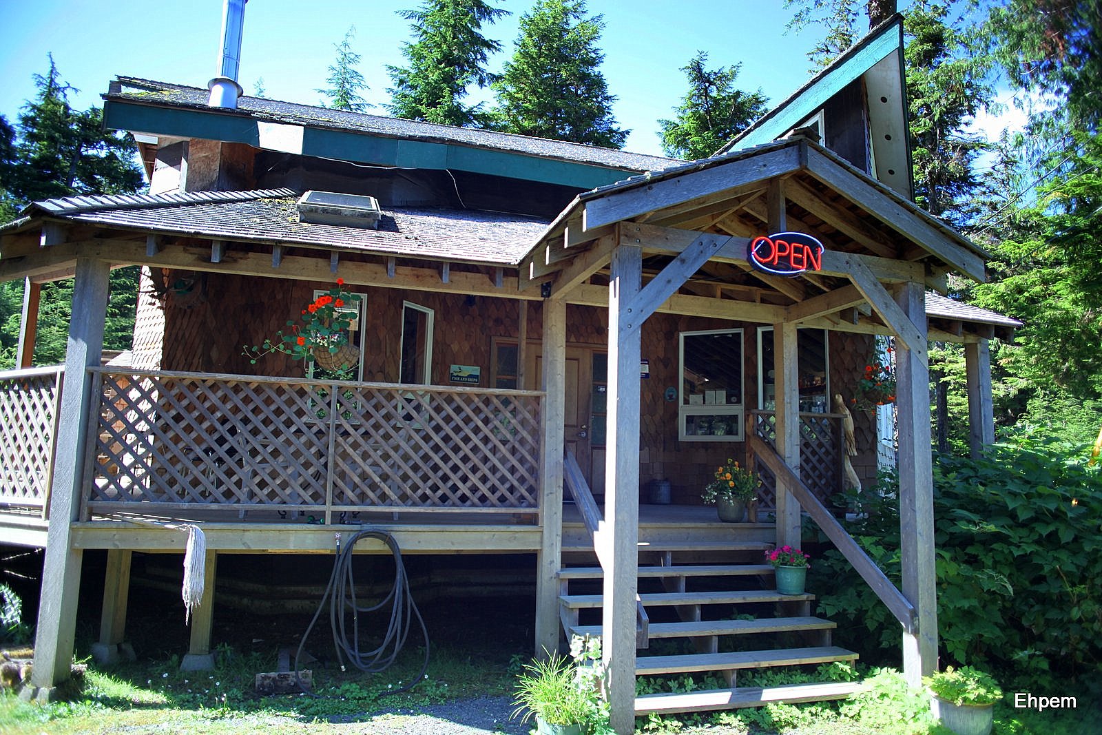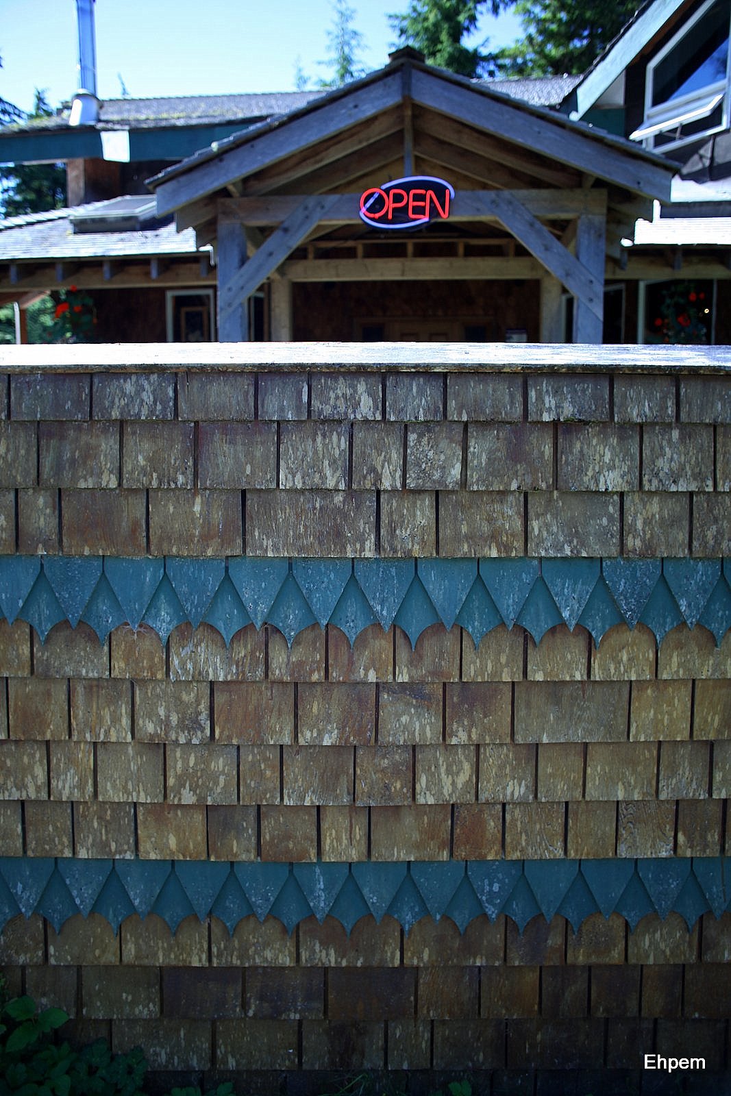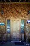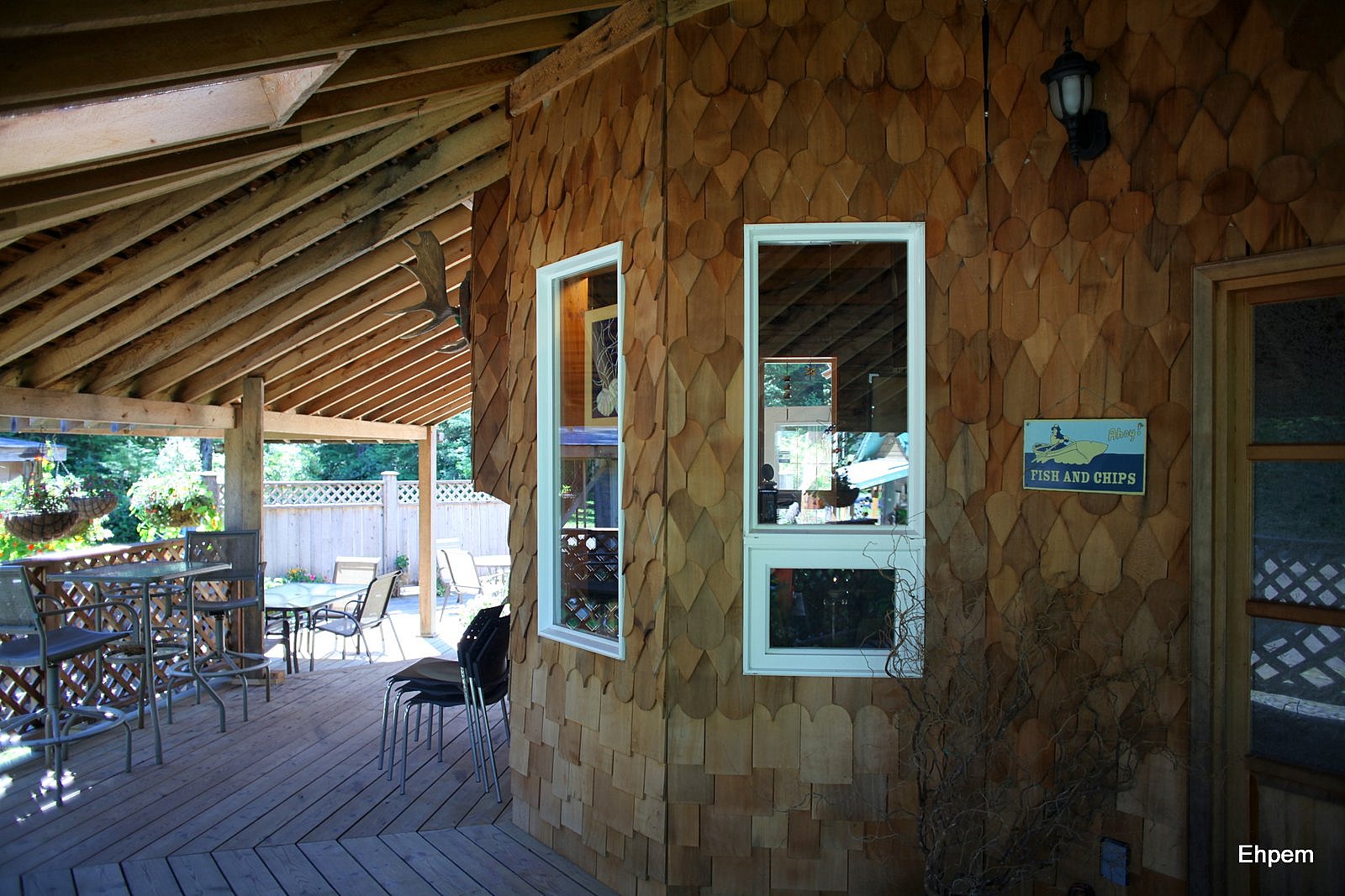 We ended up at the fish and chip shop that is south of the Delkatla Nature Sanctuary between the airport turnoff and the south end of the causeway in the Village of Masset (as opposed to Old Massett where the potlatch was held). See map here for general area. It is part of the Hidden Island RV and Fishing Resort; the rest of their business I know nothing about and have no opinion on. We had not made it for fish and chips during our visit, despite good recommendations. So, I got some pictures while waiting for our orders (which came very quickly). As the food was excellent, and the exterior shingle work very photogenic, I am happy to make this post.