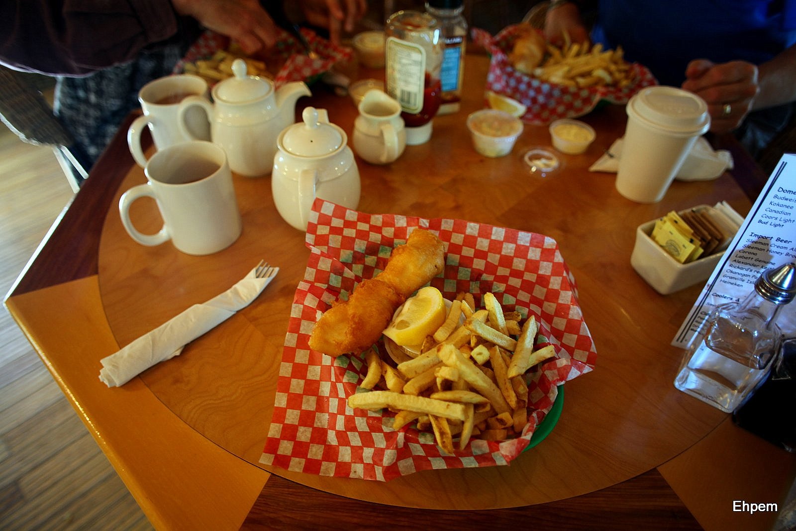 We all ordered a single piece of halibut and chips. I had tea with mine. It was our unanimous opinion that the halibut and chips were excellent – the batter was light and not too greasy, the fish fresh and perfectly done, the chips also were very good. The tea was pretty average, but since it can be hard to get a good cup of tea on the road there is good reason to say that a pot of tea that has not been ruined is above “average” in most ways – that it is served in a pot is a good starting point to being not normal. Still, there is better tea to not ruin than was served to us, so I will stick with average as an assessment. If you are in Masset and care about tea, then Grounds has a very good (though quite small) choice of loose teas, and excellent chai as well. If you are on Haida Gwaii and want good fish and chips, then Hidden Island is definitely one of the top choices.