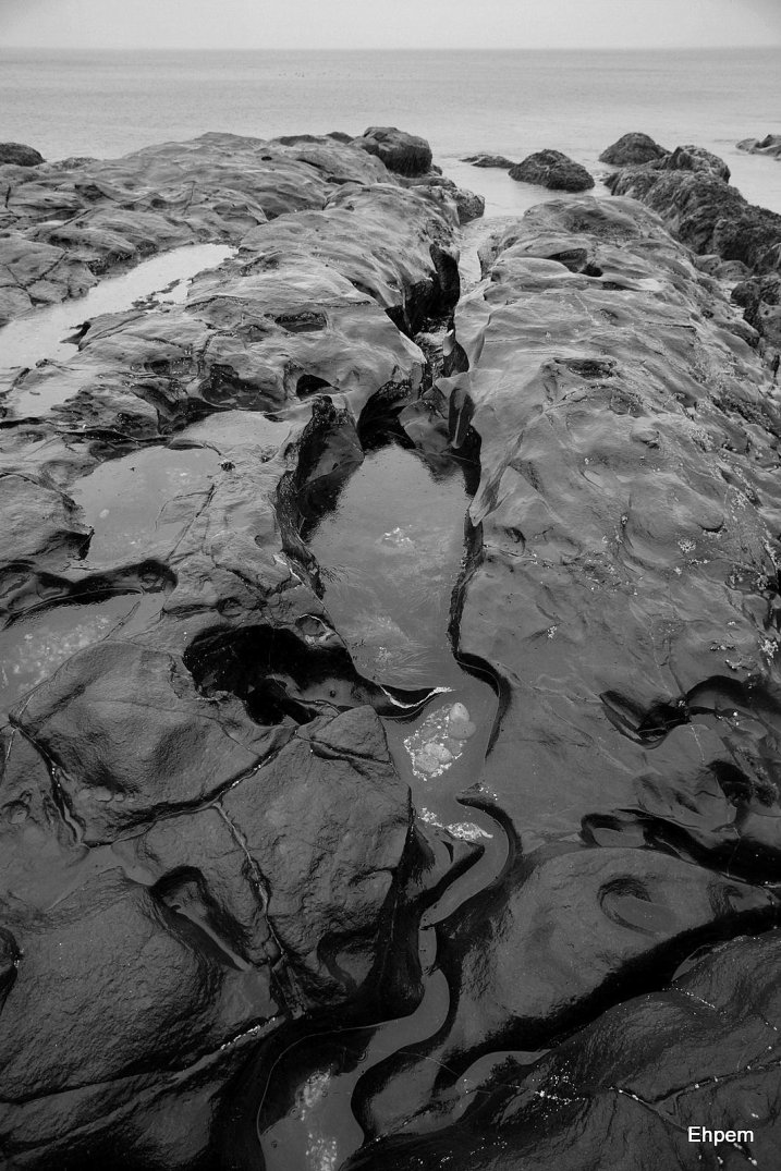 Today’s pictures dwell on the textures of the beach to the north-east of Tow Hill, the bedrock shelf that has the bird and whale turned to stone by Taaw as described yesterday, and a blow-hole that at the right tide and swell blasts a jet of water high above the rock – sadly, while we were there it only gurgled. Because of the rain and very low cloud photographic options were very much limited and thus all these shots are in black and white and concentrate on what was close to me as distance was obscured in mist.