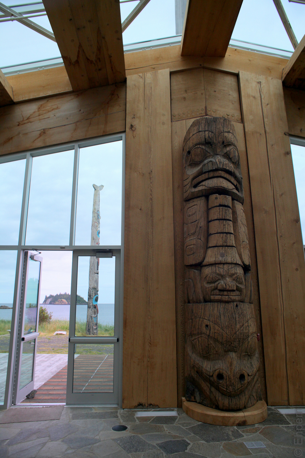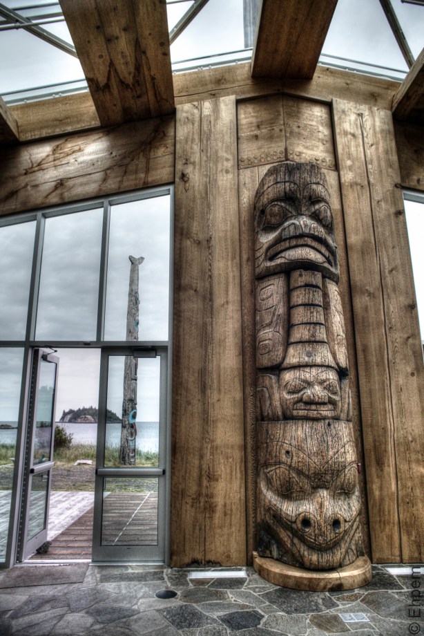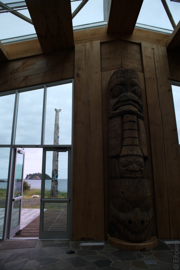 This is another view of the Haida Heritage Centre – this time inside the main entrance hall known as Stlaay Daw Naay – Welcome House. This view is with the main entrance behind me, looking out the front towards the beach and ultimately at the junction of Skidegate Channel and Hecate Strait. This is one of several joined buildings that include the museum, gift shop, café, classrooms, performance house and a carving shed and which collectively make up the Haida Heritage Centre. At the back of this complex is the Parks Canada offices. This pole is, I believe, carved in the early to mid 1800’s and collected from the village of Skedans, which is on Louise Island, just north of the Gwaii Haanas park.