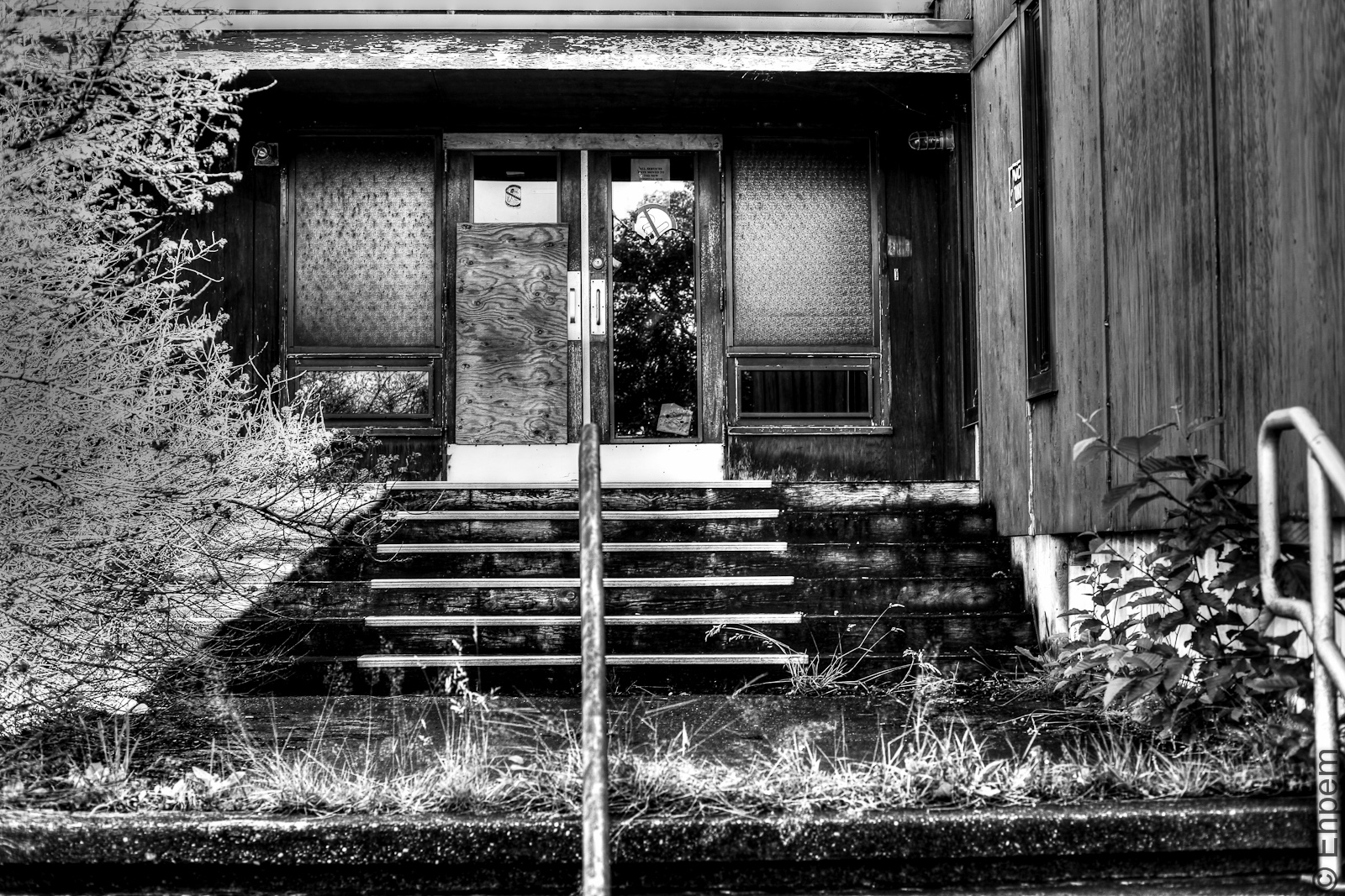 I am coming to the conclusion that I could really like some of the black and white tone-mapped conversions that seem possible (the top image suggests the potential), once I am more proficient with this software. The image above has colour that I don’t much like now that I see it against the black and grey of my blog while editing this post – I should really have another go at it to get lots of the blue out. What I really like most in that picture is the shiny rail – many years of people hands coming to and from the hospital have left a durable polish.