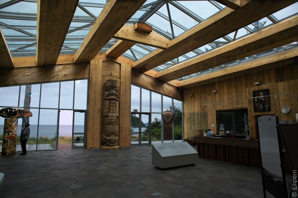 This room, as is so often the case in museums these days, can be rented for various events and receptions, such as weddings. The construction of this centre a few years ago must have added a great deal to the infrastructure of Haida Gwaii. There is a new pole in one corner that I am afraid I can find no information about, so I can’t tell you who carved it, or much else. It appears to have a transformation mask on the top of the pole allowing a bird face to transform to a human one. Whether it is just depicting such a mask which are quite common for dances, or if it has some hardware to allow it to be changed for a theatrical purpose, I don’t know since I did not look behind it.