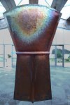 That copper is a large version of a traditional form – coppers were and are exceptionally expensive powerful things in Northwest Coast cultures – often they are painted with a designs. A brief description can be found at this link.