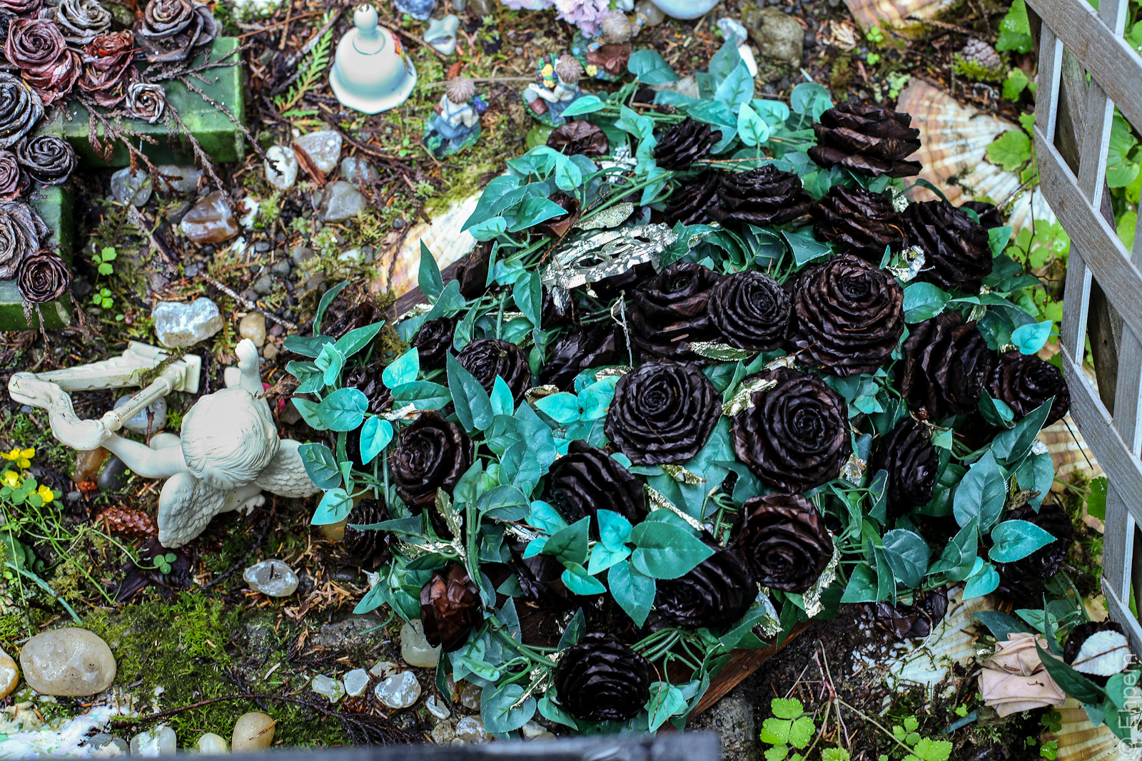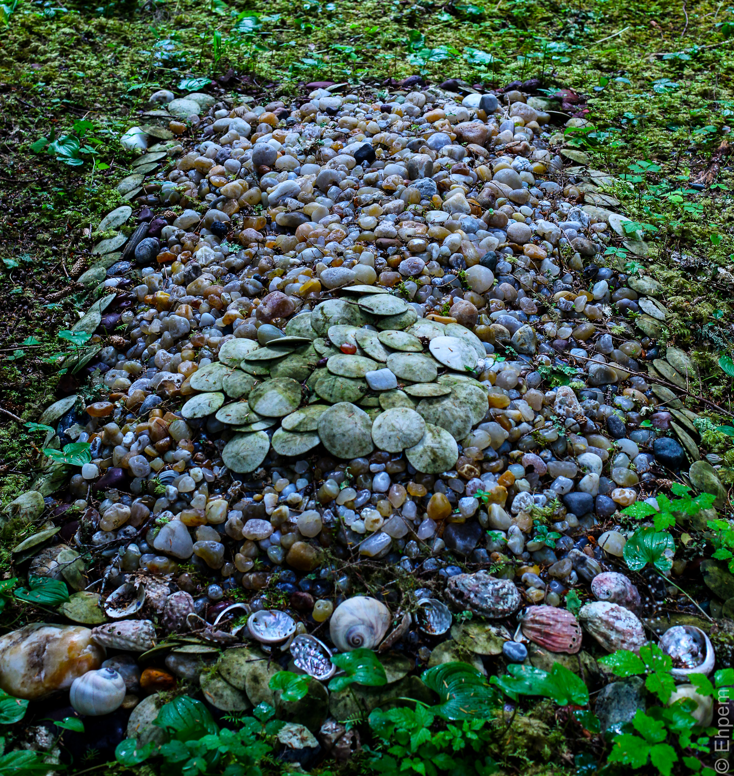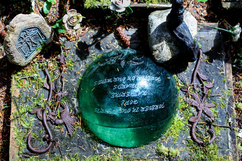 The Village of Masset has a wonderful cemetery set in the forested dunes on the far side of Delkatla Nature Sanctuary from Masset. It is a wonderfully natural setting, with the forest growing among the graves, and moss covering everything, and a perfectly local expression of grave ornamentation, for instance with many graves having a few, or many, agates or shells or cedar-bark flowers, glass fishing floats or other local adornments. It is interesting to see so many scallop shells – I wonder if they are placed in the knowledge of their ancient associations with Christianity (I have excavated a Roman coffin adorned with scallop shells cast into it’s lead lining) or if they are used in the same way as are the local stones, and other things from the sea and land.