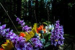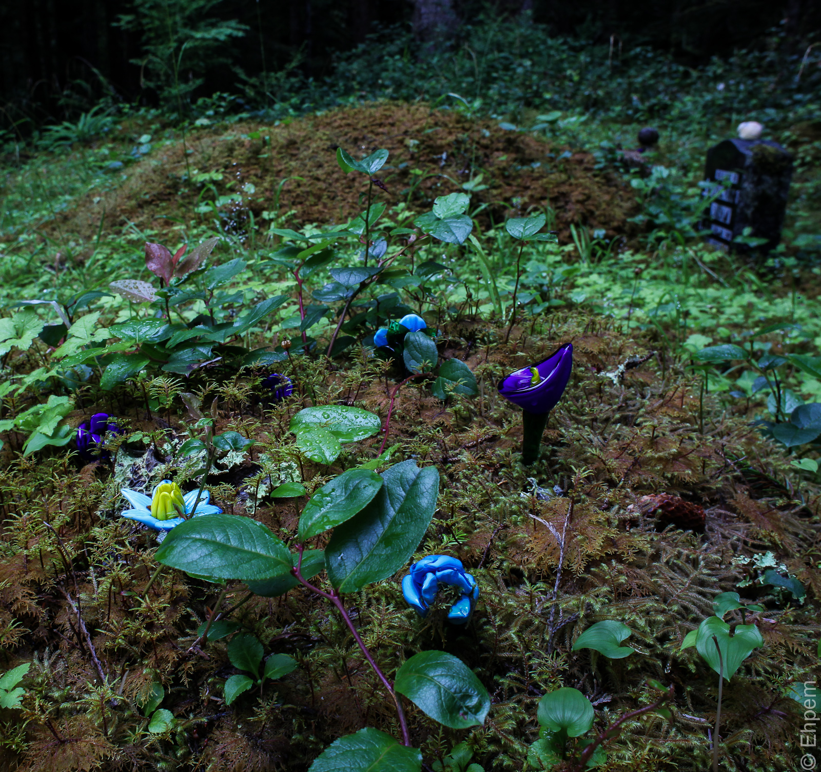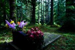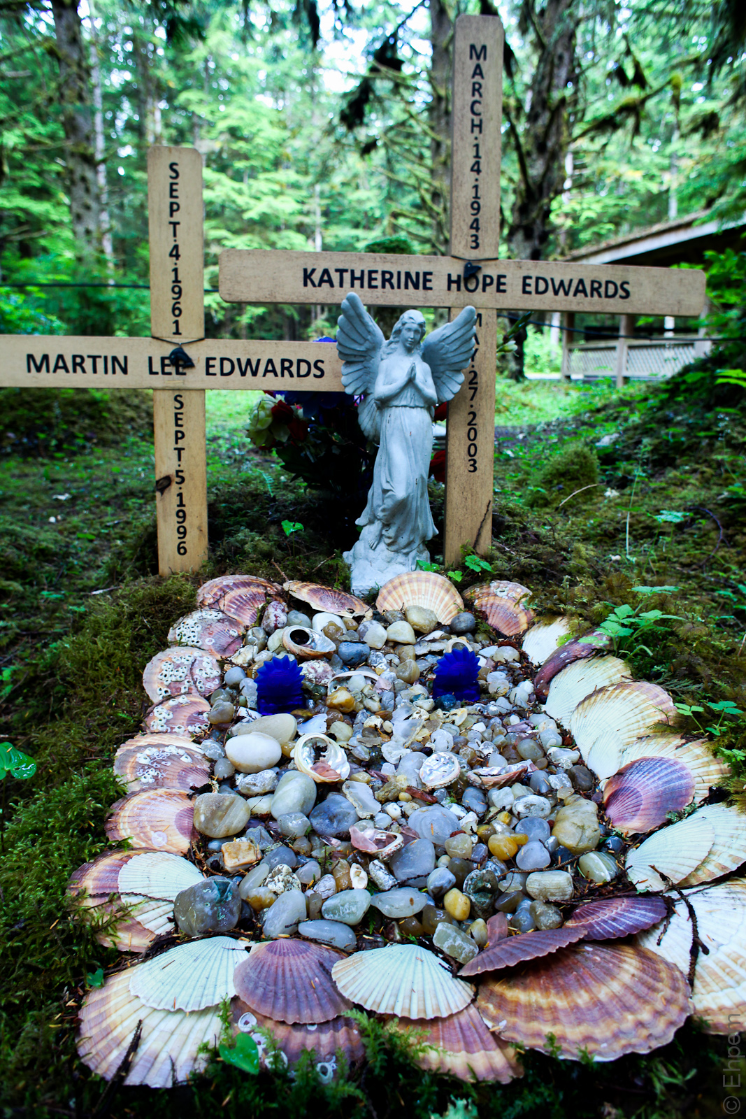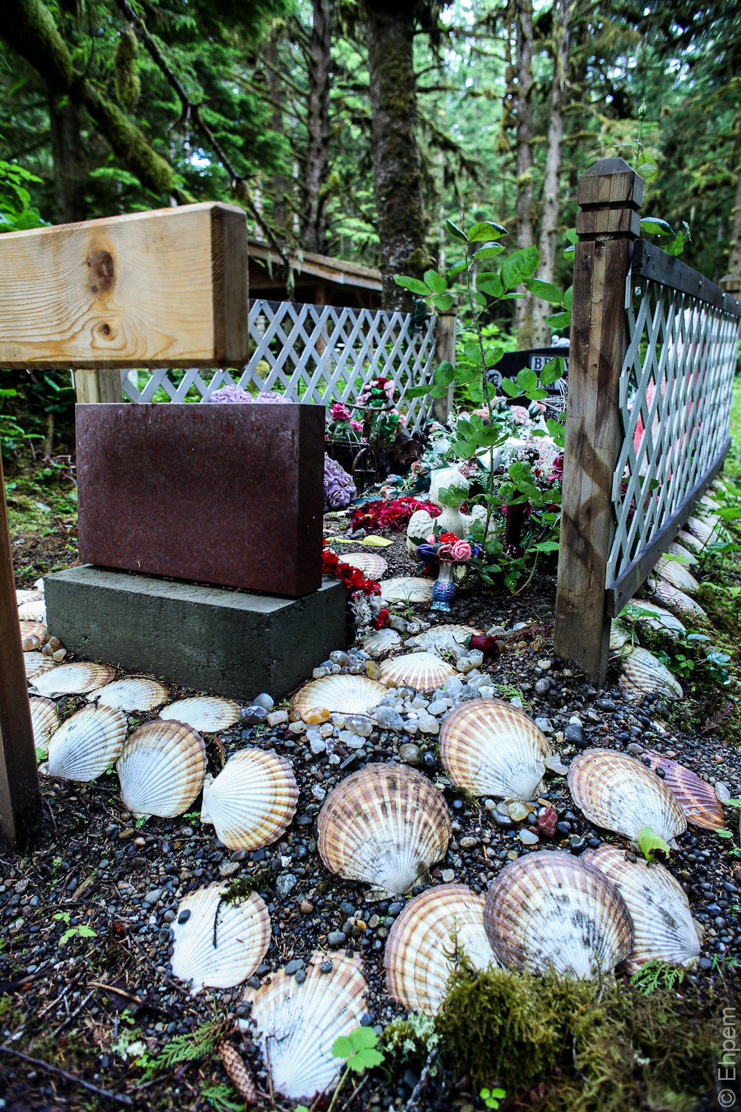 This is not a Haida cemetery, though it seems a number of Haida are buried here. The Haida cemetery at Old Massett has strict signs forbidding photography (as does the one at Skidegate) so I have no photos for comparison from those places. I was struck by the environment of this cemetery – if one is going to be buried, what better kind of place to end up? In the next few days I will show other views of this cemetery – some of the older parts, possibly some b&w treatments. And, I was also struck by the things left on the graves – I doubt very much that many of these would last in an urban cemetery for more than a few days before someone helped themselves.