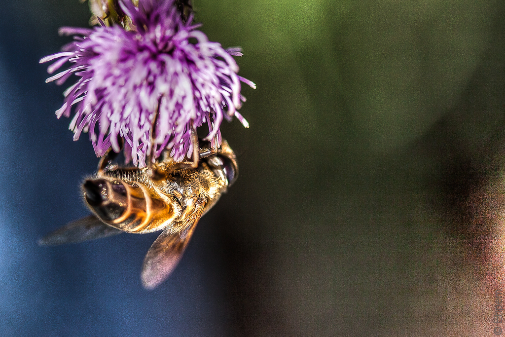 More insects collecting pollen on the thistles at Island View Beach last weekend; this time it is a fly in disguise as a bee.