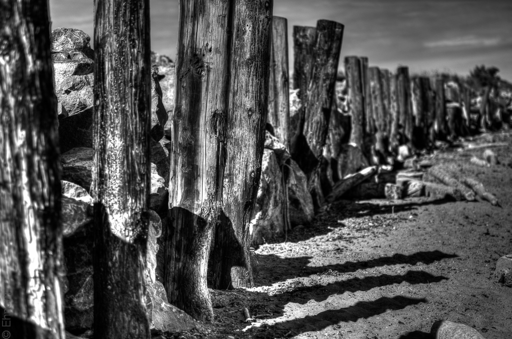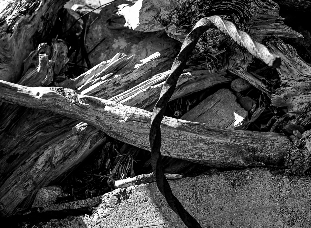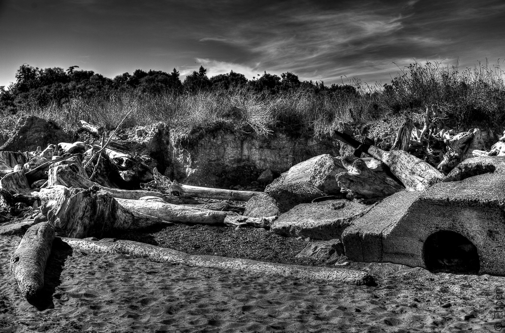 Anyway, that is my rant. The last few days have shown the very small patches of beauty struggling within this mess. Today’s photos show some of the junk, as aesthetically as I could bring myself to do. These also continue my experiments with learning how to tone-map single images, and produce HDR photos from multiple brackets. Some of my shots are shown in both colour and black and white, or in two different kinds of b&w HDR treatment when I can’t decide which I like best, or where the two versions convey different information. Mostly I favour the HDR images produced in Photomatix over the edits to 32bit HDR images that have been merged to Lightroom. The latter are just too kind and gentle for the mood I ended up with after walking along this part of the beach.