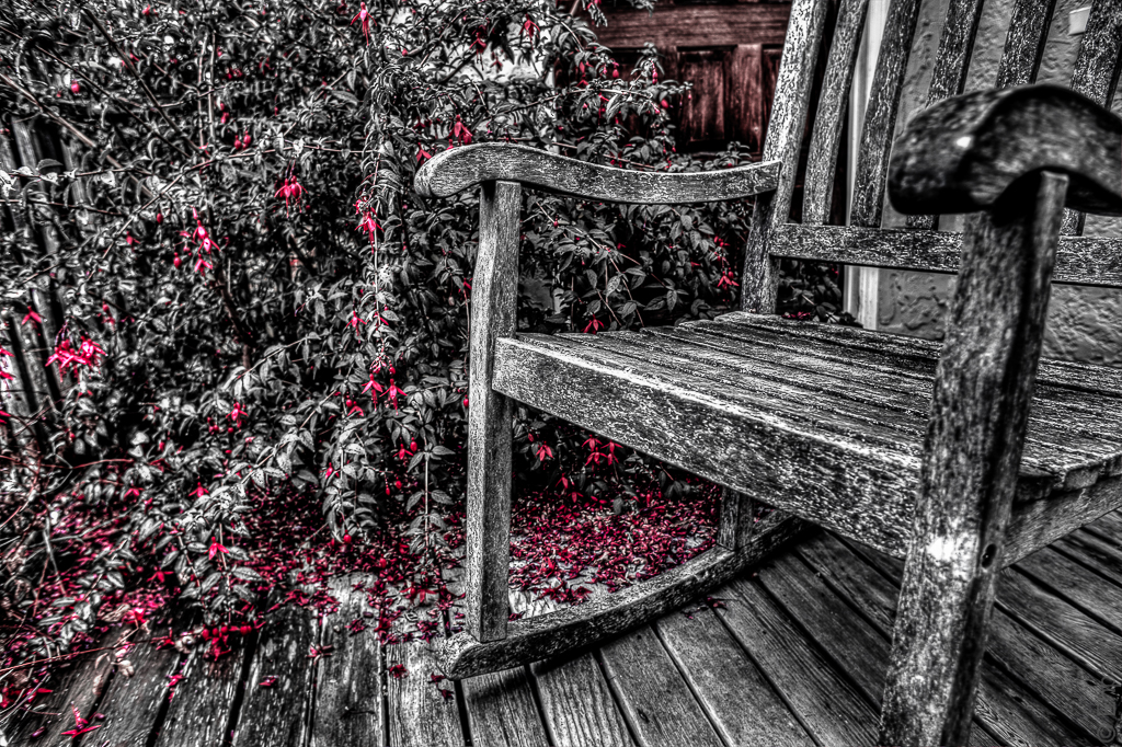 • “black and white’ processed as HDR, hand-held brackets at 1/15th, 1/40th, 1/100th for rocker, and 1/30th, 1/80th, 1/200th for blossom details.