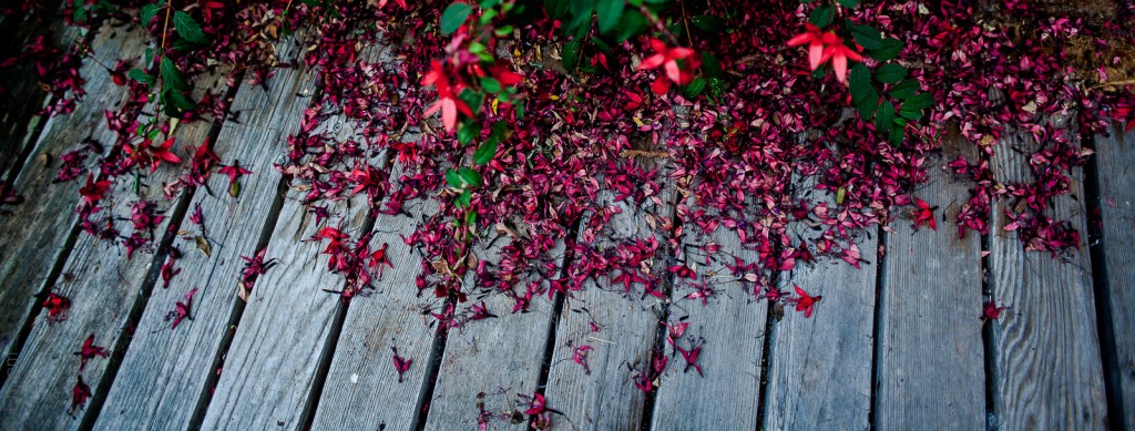 This rocker is on the front deck. A fuchsia has taken control of one neglected corner, and being neglected, dropped blossoms have collected in a small drift on the cedar boards.