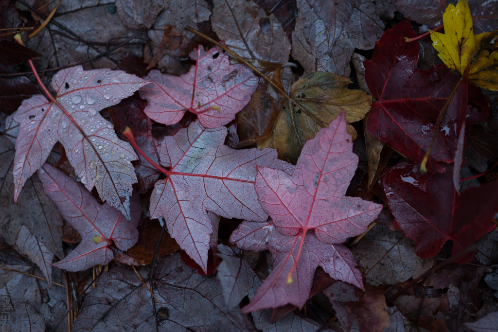 That red leaf is almost too much for me. Can you imagine a carpet of those on the ground? I think my camera sensor might just pack it in if I exposed it to too many of those leaves. The underside is very much more my kinds of colour.