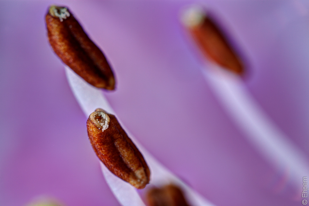 Yet more shots from the bellows macro, this time of a rhododendron blossom, clearly showing the petal’s cells in the top image, and the pollen grains on the anther in the middle image.