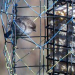 We have put a cage around the feeder to discourage larger birds and squirrels. The starlings can eat one of these cakes of food in a matter of minutes, crows too. Some other larger birds like flickers and woodpeckers find a way of reaching in, so we get to see them and don’t lose out too much by encouraging the small birds. The cage does make for busy photographs though.