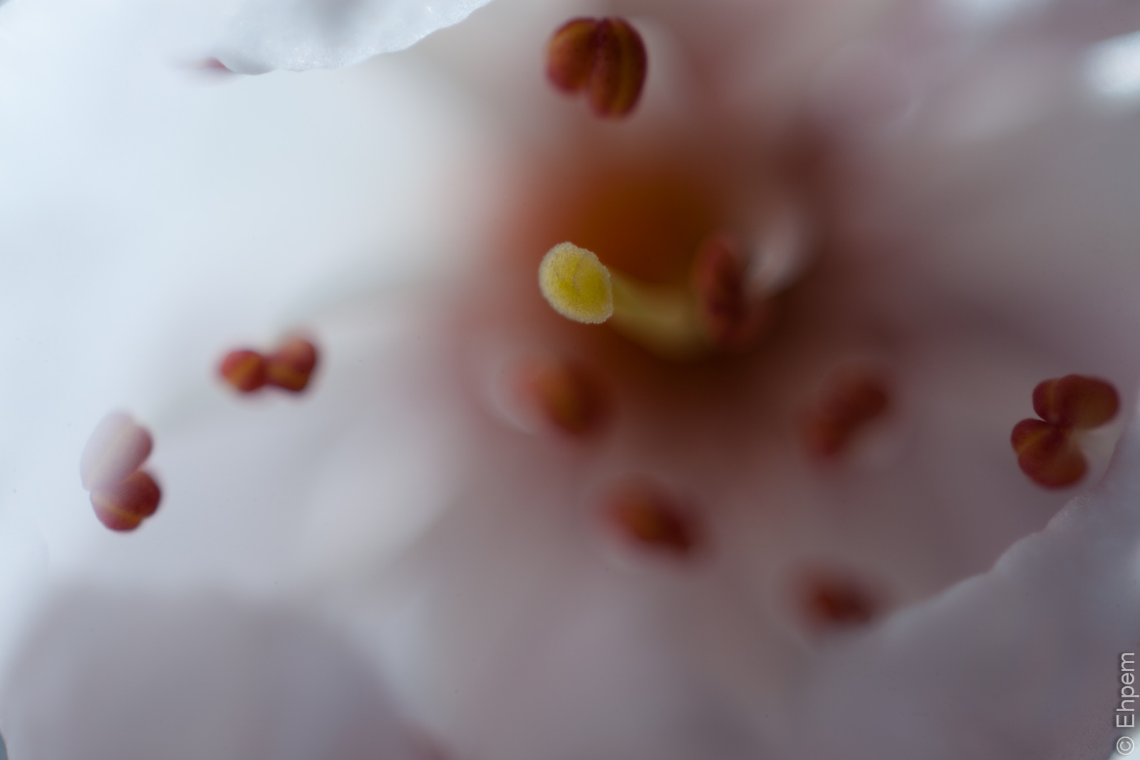 I took these shots two weekends ago, but had forgotten them somehow, with house guests and all that. They are close-ups, at about 3X magnification, of a flowering plum blossom brought inside from a tree in the front yard. Other than very early blossoms, the most notable thing about this tree is the way it brushes past the face of passengers leaving our car in the driveway – kind of nice when blooming, kind of annoying when full of rain.