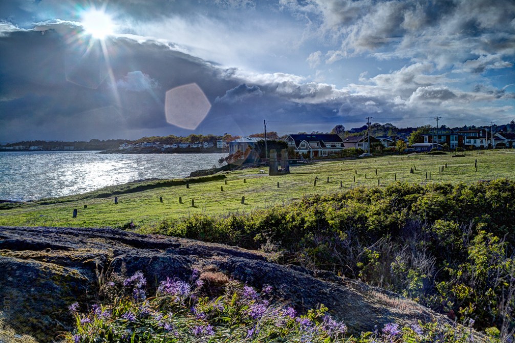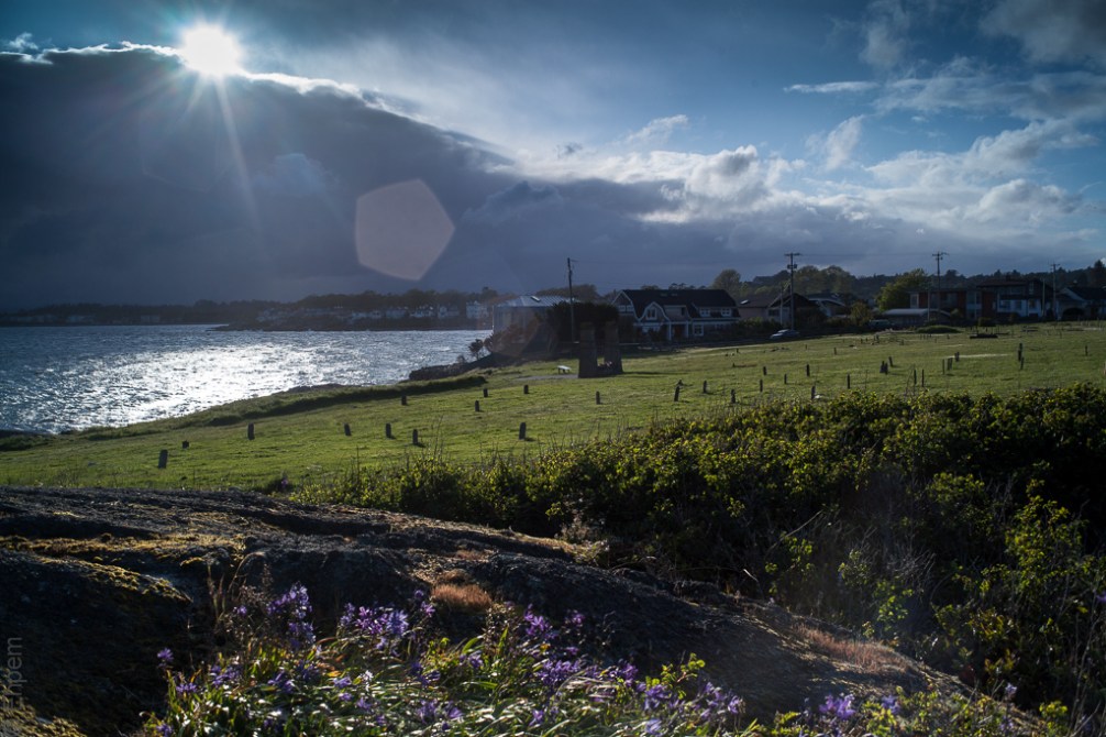 I can’t decide if the flare ruins the photo. I tried different treatments and I think that the Lightroom split tone preset (below) applied to the HDR image (above) allows the lens flare a more comfortable home in the photo. But I do like the camas in the foreground in the colour versions.