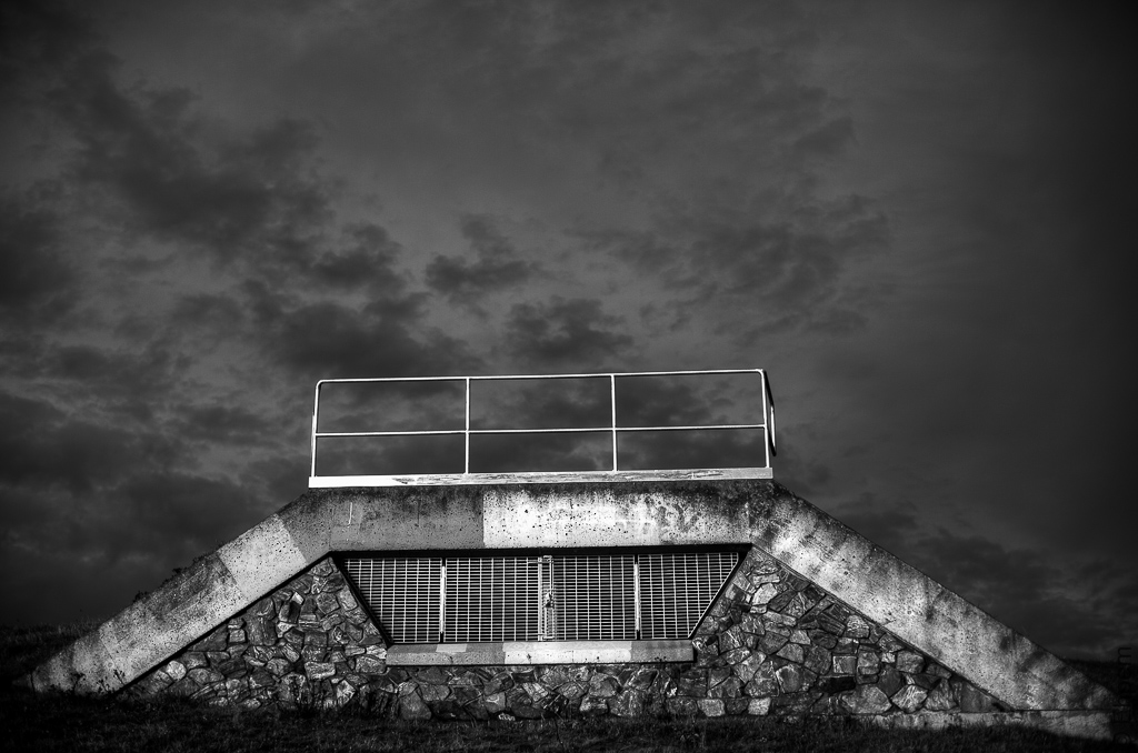 These pictures show the walls that hold up the underground works and the barriers which prevent people from tripping over the edge to land broken on the asphalt below. I begin the post with a view from below of a vent structure, and end with the sunrise viewed from the top of the same place, which was what I pulled over to capture in the first place. The light was so nice on the rock walls, that I decided to photograph them too. I took brackets and processed these as HDR to deal with the dynamic range in the sunrise shots, and then left that setup because I knew I could get nice gritty black and white processing for the stone walls. I hope you approve of this choice.