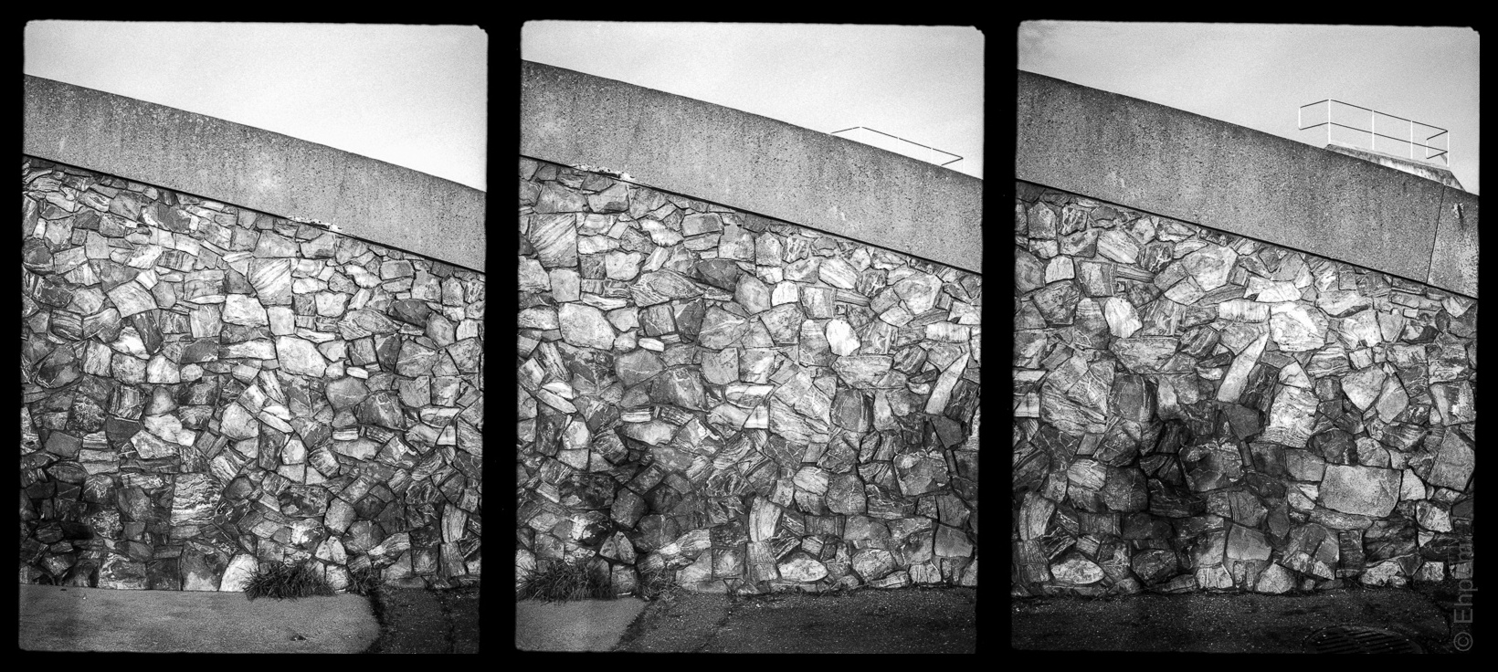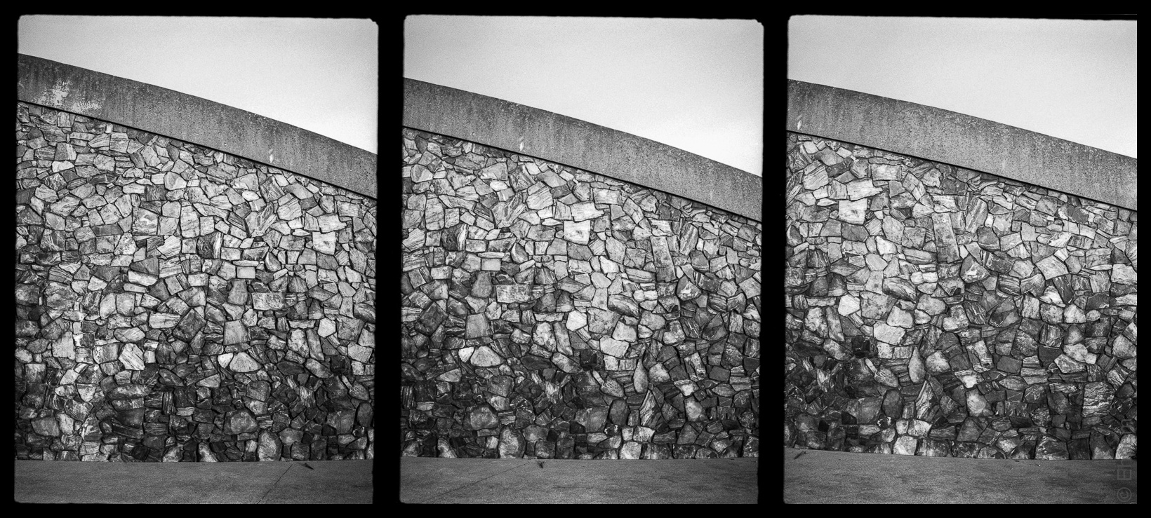 This wall curves around a >90 degree corner and to take the pictures I walked around the wall trying at first to keep a similar amount of the frame covered by wall (that meant getting closer as the wall got shorter) and then when my shadow started to predominate just keeping a similar distance from the wall. I also tried to slightly overlap the photos, but that was tricky as there are no highly visible landmarks on most parts of the wall. There is an implicit motion in these pictures, especially in the way the metal rail over the vent structure slowly comes into view turning its face to the camera. This motion is not otherwise visible in the wall as it is curved and each shot is from a similar angle to the curve.