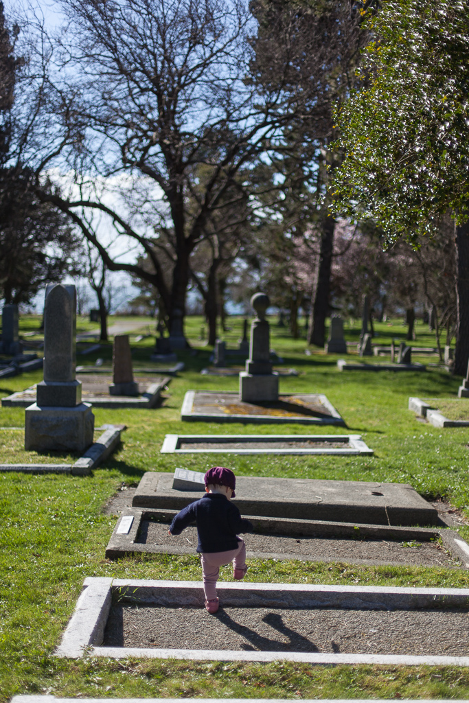 A couple of days ago I went for a walk with my daughter and granddaughter. All three of us walked a long block to the cafe at Fairfield Market, where us adults had our noses wiped and otherwise were taken care of by the youngest. Then she was slung onto her mother and we continued on to Ross Bay Cemetery, where she got back on her own legs.